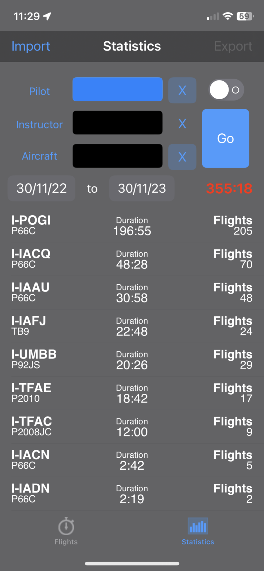 It is possible to search for activities by Pilot for a single aircraft and by Instructor by combining the search parameters as desired, it is clearly also possible to define a time interval for which you wish to carry out the search.