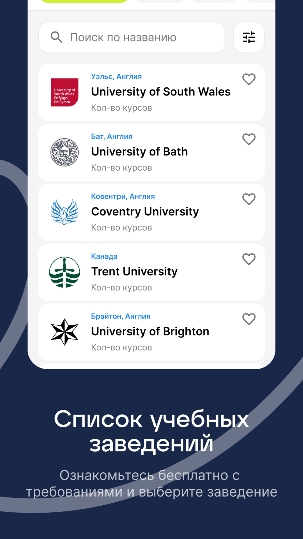 Выбирай университеты и программы и подавай заявки в несколько кликов. Ты сможешь совмещать учебу и путешествия. Найди и сравни университеты и курсы, составь список своих предпочтений и посетите дистанционные консультации. Весь процесс подачи заявки в приложении — бесплатно!