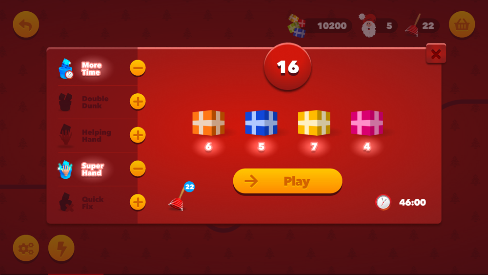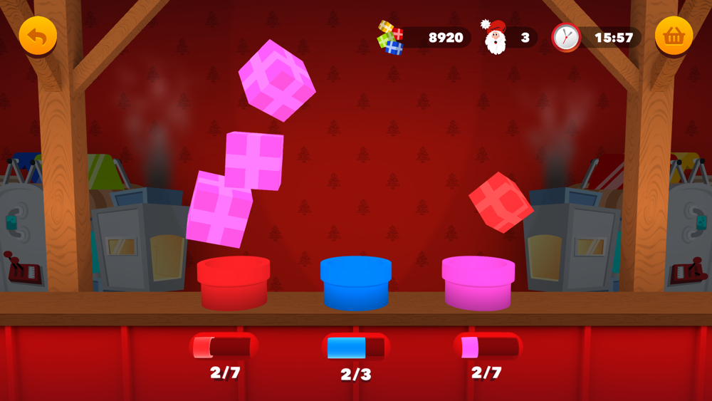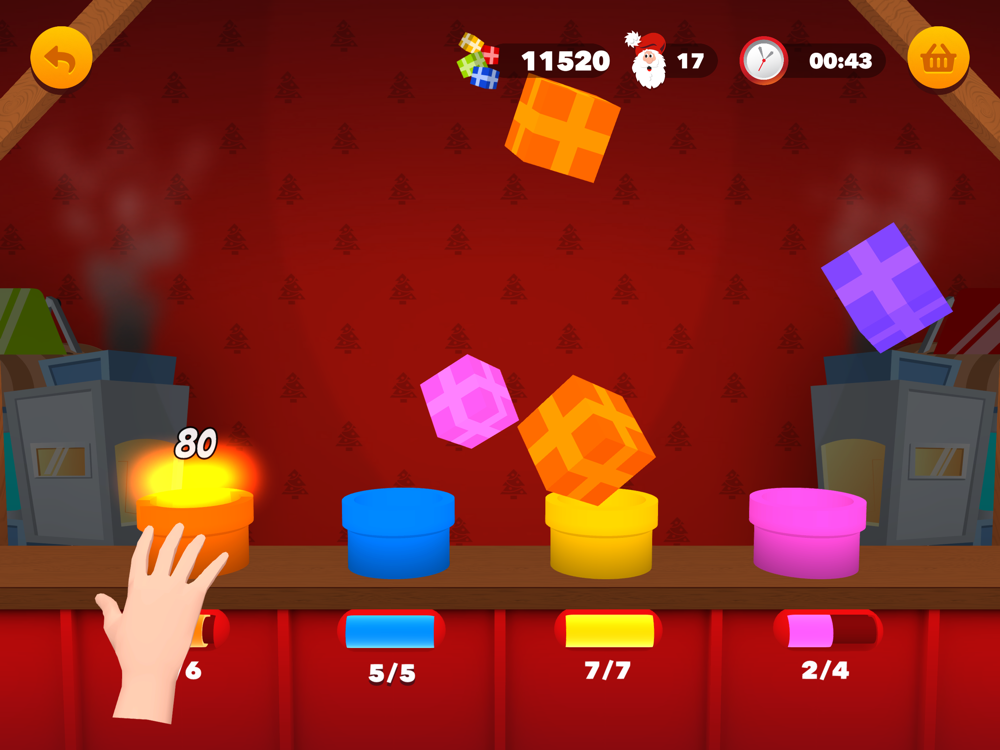Oh no! Santa's wrapping machines are broken. All presents are flying everywhere and you have to help to make sure they get to the right place quickly. But... Just your speed is not enough. This fun game contains powerups you can earn or buy. With the Helping Hands, Quick Fix, Extra Time and Double Dunk, you can sort the presents faster and easier. And that's needed, because you have to complete your assignment in time. Finally. Watch out for the candy crush. It might cause you to have to start all over again.