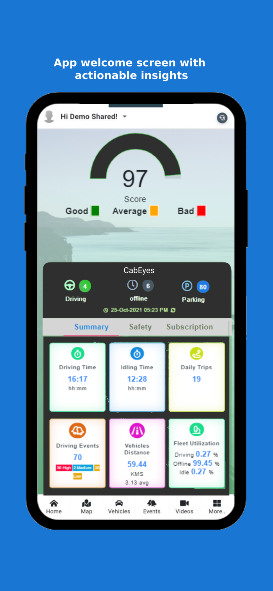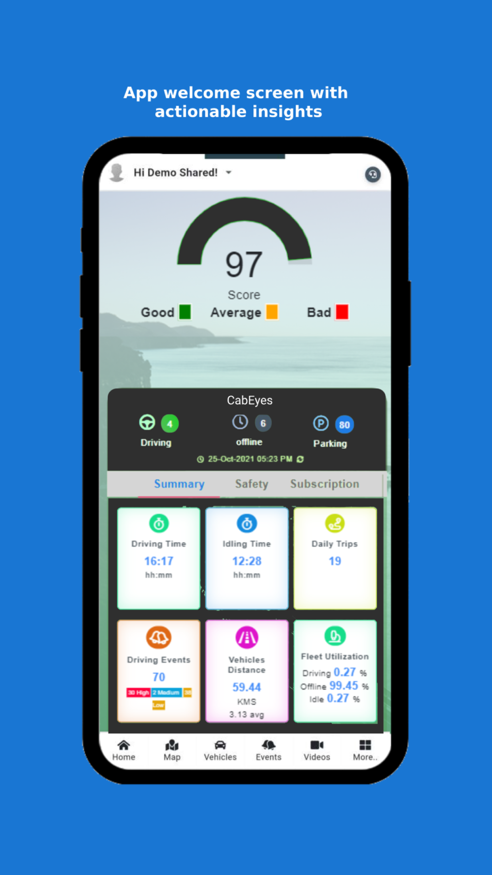 Enhance your fleet management with the CabEyes Fleet App - a powerful tool that brings efficiency and control to your fingertips. Whether you're overseeing a small business or a large enterprise, CabEyes Fleet App provides comprehensive tracking, telematics, and communication features to optimize your fleet's performance.Real-Time Tracking and TelematicsKeep an eye on your vehicles, assets, and driver locations in real-time with our advanced GPS tracking system. Customize your map view with satellite and traffic filters, and easily find the right driver, asset, or vehicle. Filter and search by vehicle status, maintenance issues, groups, and more. Say goodbye to endless phone calls - see real-time locations and ETAs instantly.Maintenance MonitoringEnsure the health of your fleet with detailed telematics data. Regular vehicle checks and maintenance records or odometer readings effortlessly.