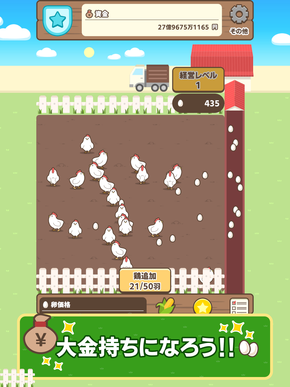 稼いだ資金で鶏を追加したり、えさを購入して卵単価を上げて、養鶏場を強化していくことができます。