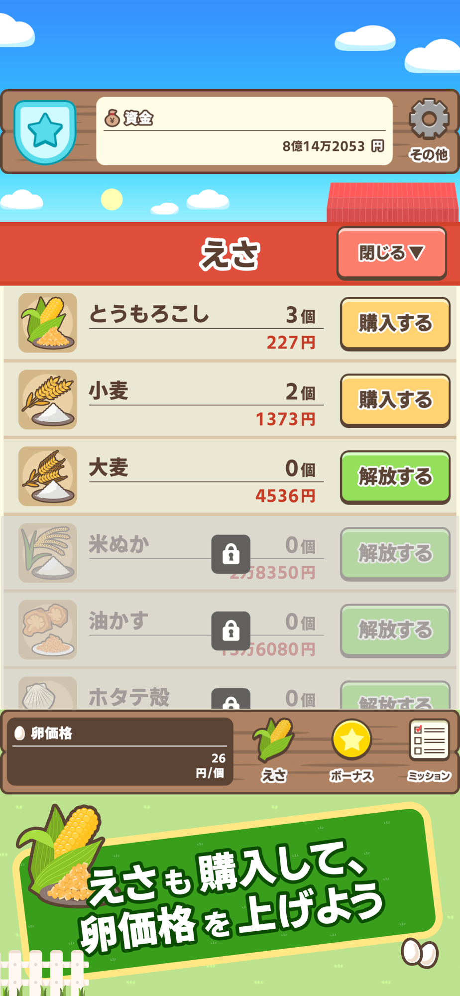 えさを購入すると、卵単価を上げることができるぞ