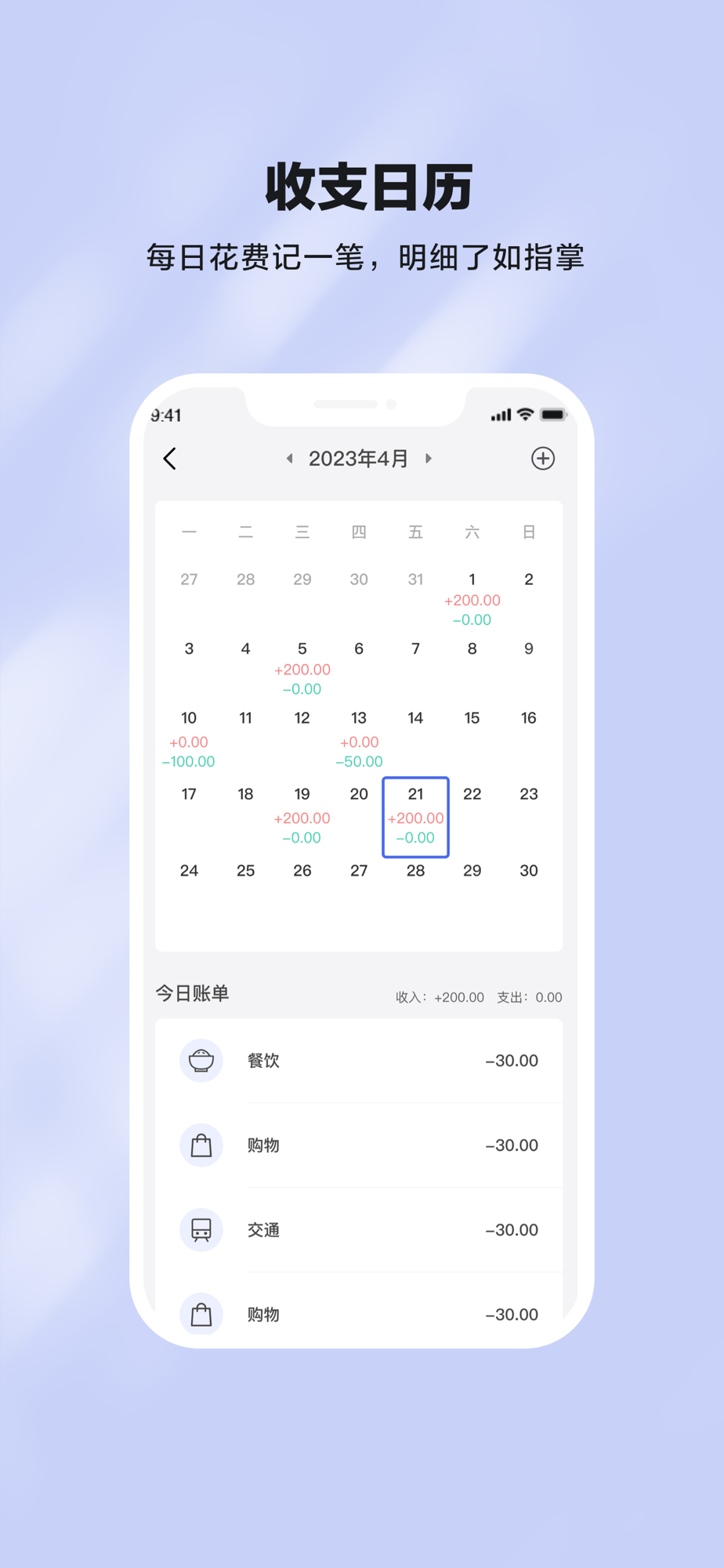 **简单易用的界面** 提供直观且用户友好的界面,让您在几秒钟内完成记账,轻松管理个人财务。