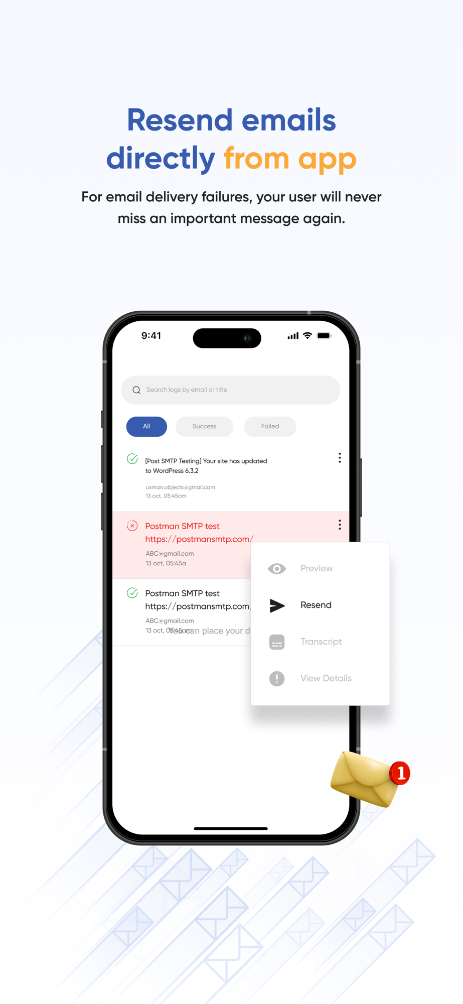 PostSMTP Mobile App is the only app for WordPress email delivery monitoring, which helps you notify regarding email failures, show error details, preview the content of emails, resend failed emails, track multiple WP sites and more.