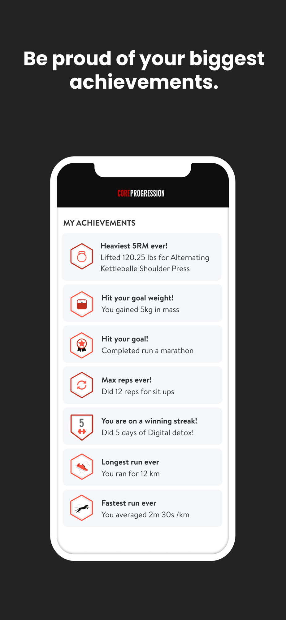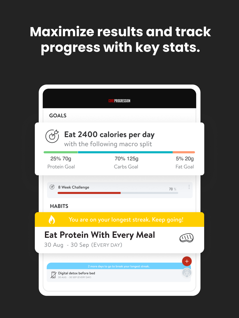 With the Core Progression App, you will have access to workout programs designed specifically to help you reach your fitness and health goals! You can follow & track your workouts, your nutrition, your lifestyle habits, measurements and results–all with the help of your coach.