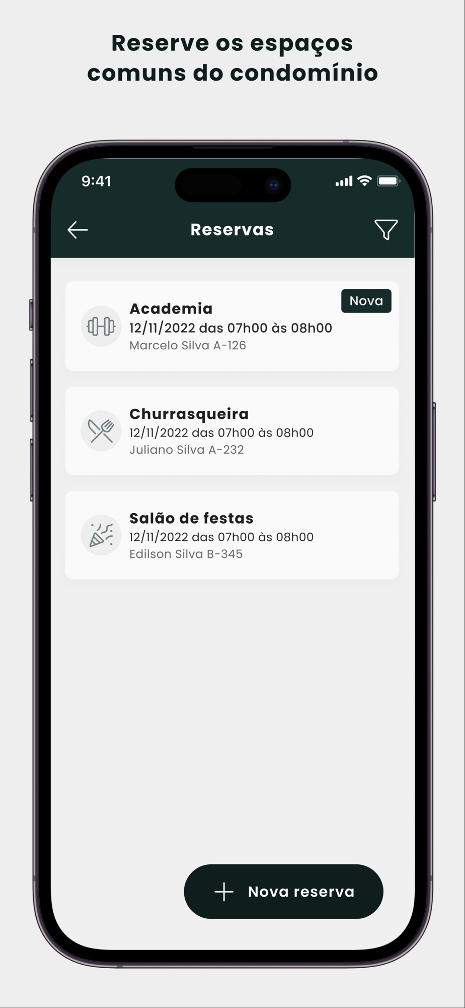 • RESERVAS: Moradores realizam reservas dos espaços comuns (churrasqueiras, salão de festas…) através do app Conviver Sensia. Chega de ligar na portaria ou síndico para consultar a agenda dos espaços.