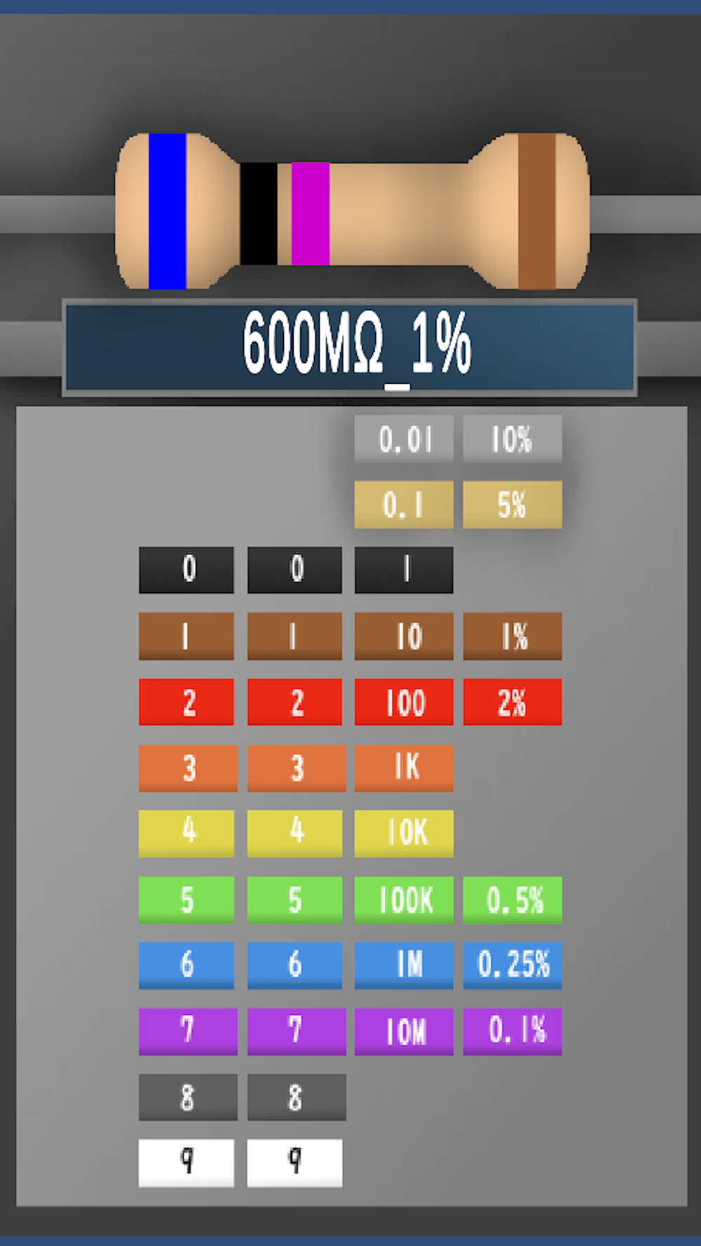 Simple resistor barcode calculator. It helps to determine the value of 4, 5 or 6 bar components. Simple, intuitive operation comes down to choosing the right colors. Moving the screen allows you to change the operating mode.