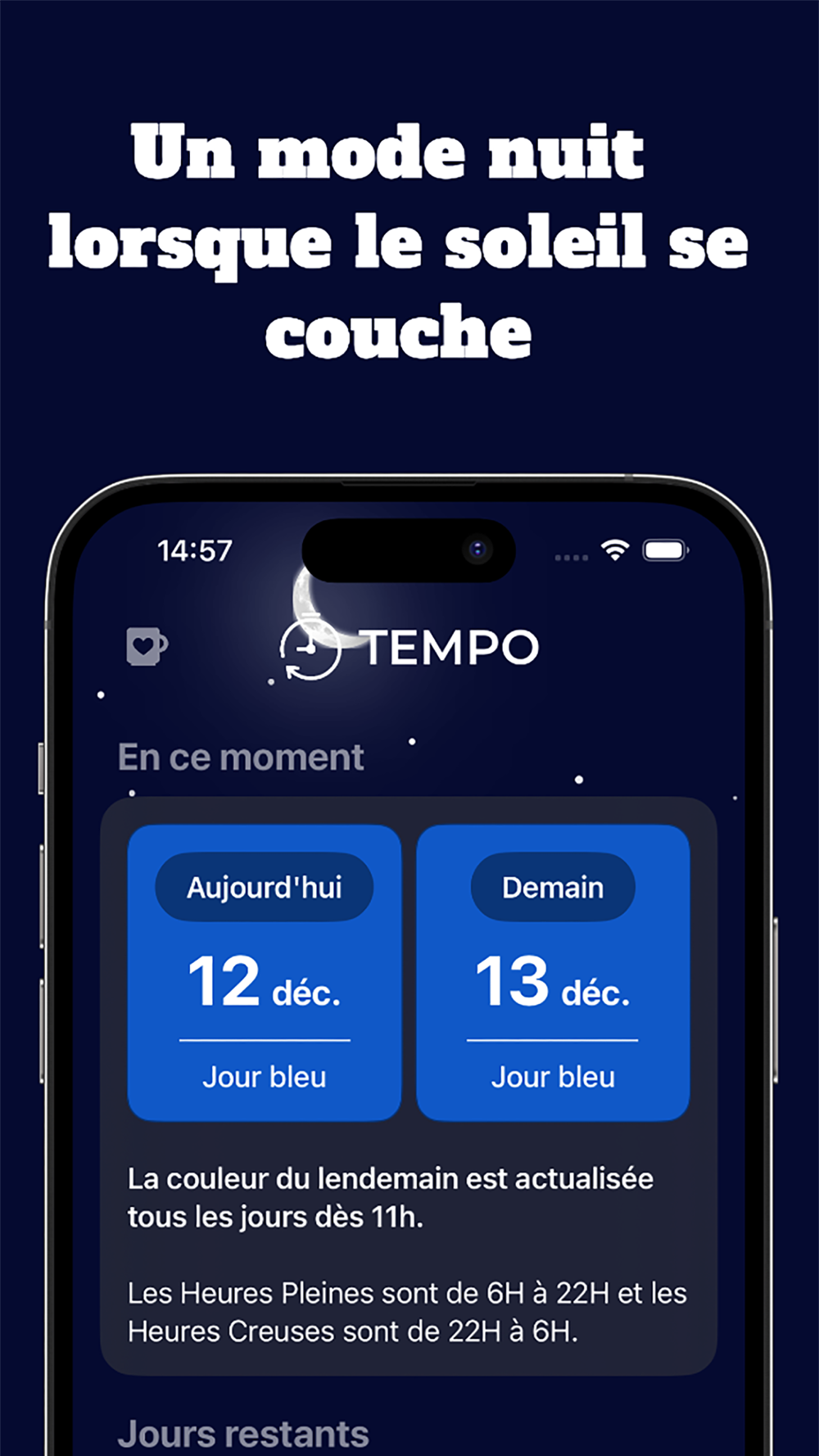 De plus notre application Tempo Tempo Bleu, Blanc, Rouge vous fournit un historique des jours Tempo de la période en cours.