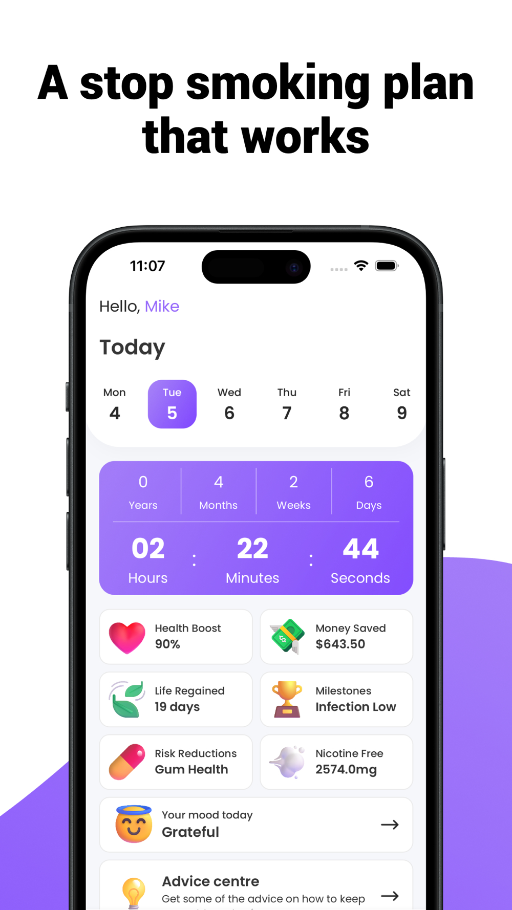 - Mood Tracker: Stay in tune with your emotional health. Our mood tracker helps you identify patterns and offers coping strategies for moments of stress or craving.