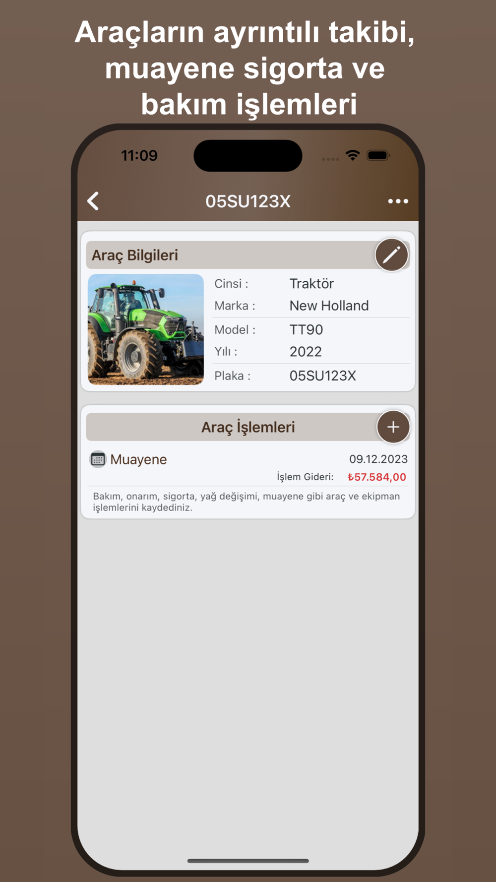 Kullandığınız tarım araçlarını ve ekipmanlarını sistematik bir şekilde kaydedin. Bakım tarihlerini, yağ değişimilerini belirleyerek araçlarınızın ömrünü uzatın. Aralarınızın sigorta, periyodik muayene işlemlerini kolayca takip edin, uygulama bildirimleri sayesinde önemli tarihleri kaçırmayın.