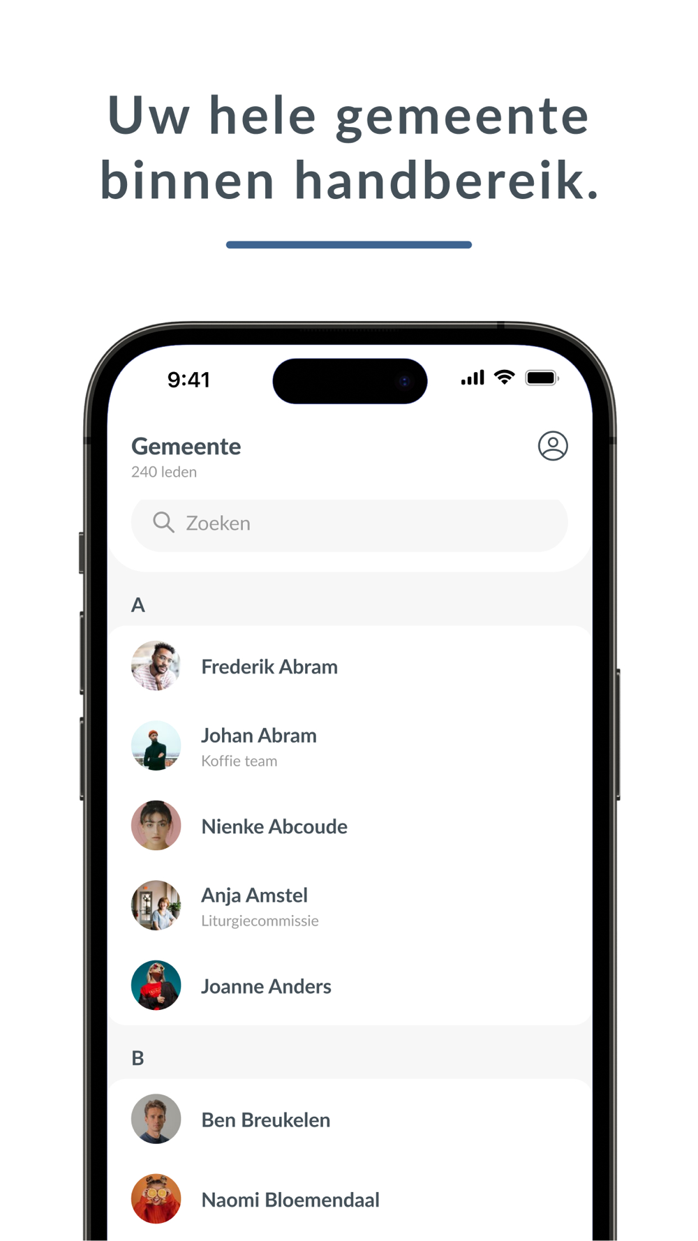 Wie zoekt er tegenwoordig nog een telefoonnummer op in het telefoonboek? Vrijwel niemand! Dankzij de gemeentegids feature is iedereen binnen uw kerkelijke gemeente terug te vinden. Snel berichten sturen, naar een adres navigeren of zien wat iemands rol in de kerk is? Met de digitale gemeentegids wordt het makkelijk.