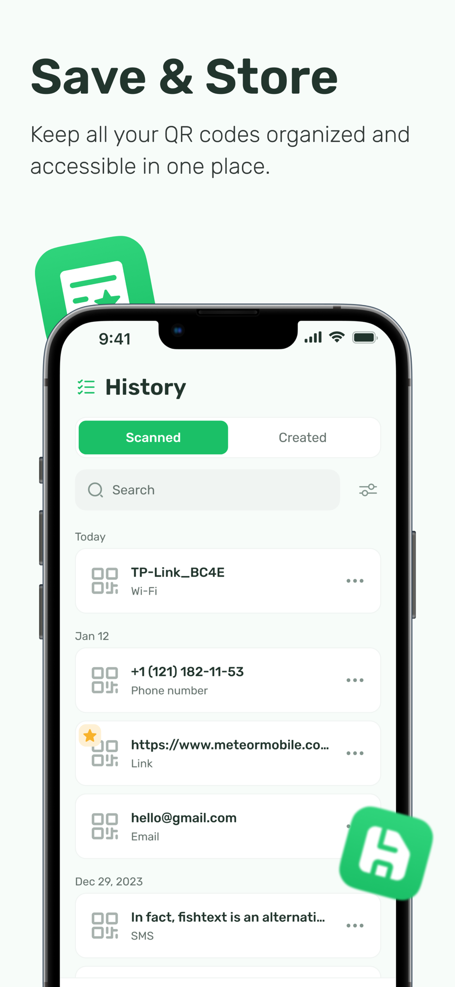 Revisit previously scanned links easily with history that saves all your past scans in one place. Easily access websites, contact info, WiFi logins, events and any other QR codes you previously scanned..