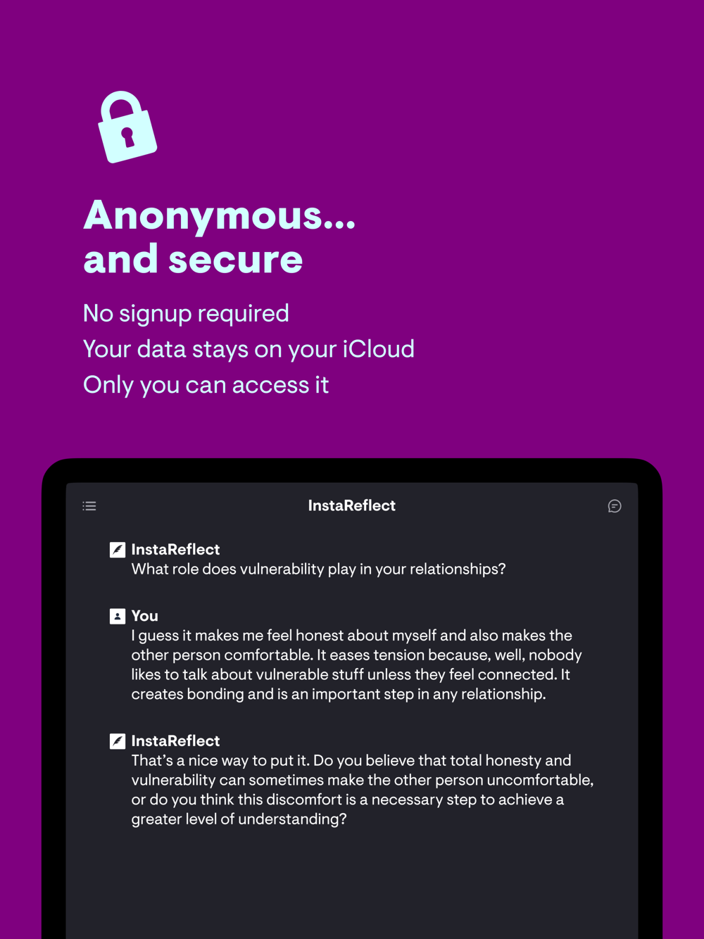 P.S. Regarding privacy, I care about it as much as you. InstaReflect neither requires nor collects any personally-identifying information. There’s no signup required. Your data stays on your device and on your iCloud. Whenever you send a message, the app connects to the server to record an action and fetch a reply. But that isn’t used to track you in any form whatsoever.