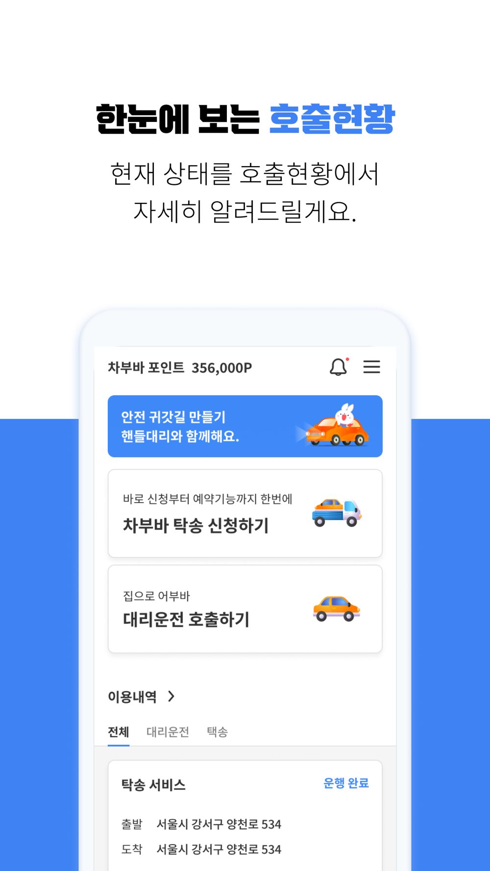 4) 실시간 호출현황 보기: 자신과 대신 불러준 대리운전 기사 호출 현황을 접수부터 운행상황까지 한눈에 볼 수 있습니다.