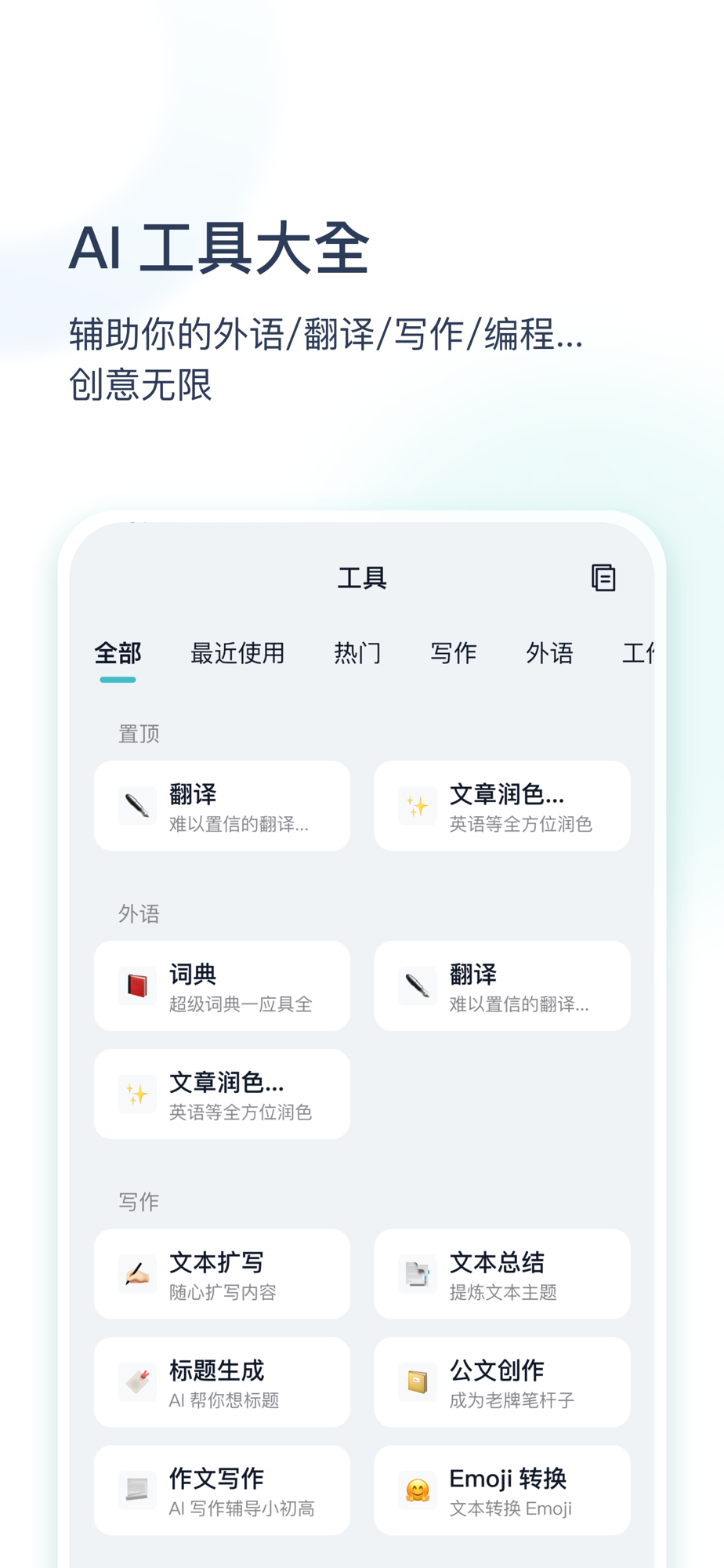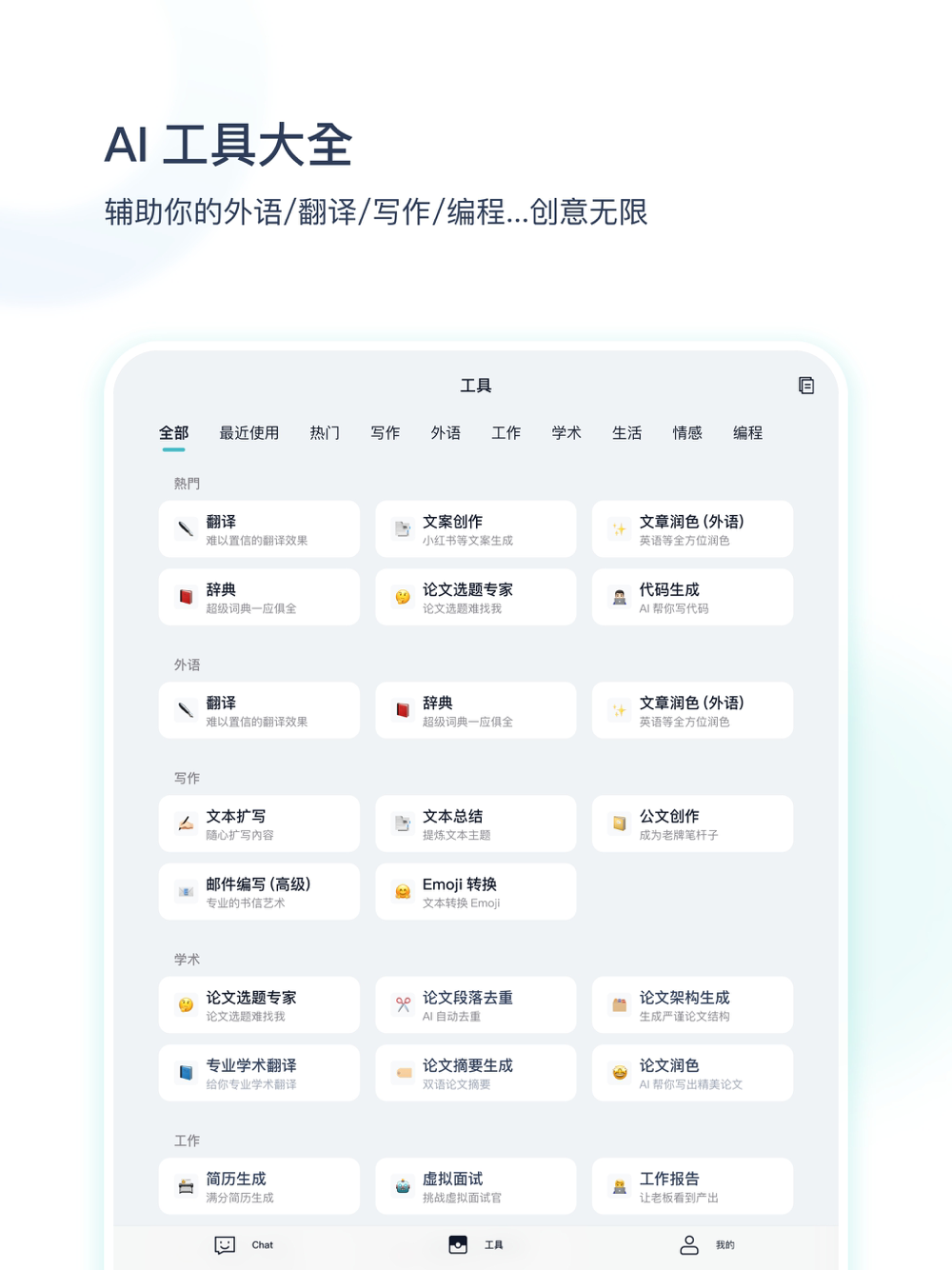 • 切换各种角色为你服务:翻译、面试指导、学习咨询、旅行协助、健身指南...