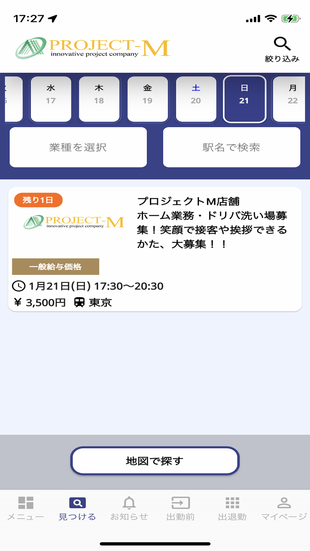 業種、駅、日付などを条件に希望の求人を探しましょう!