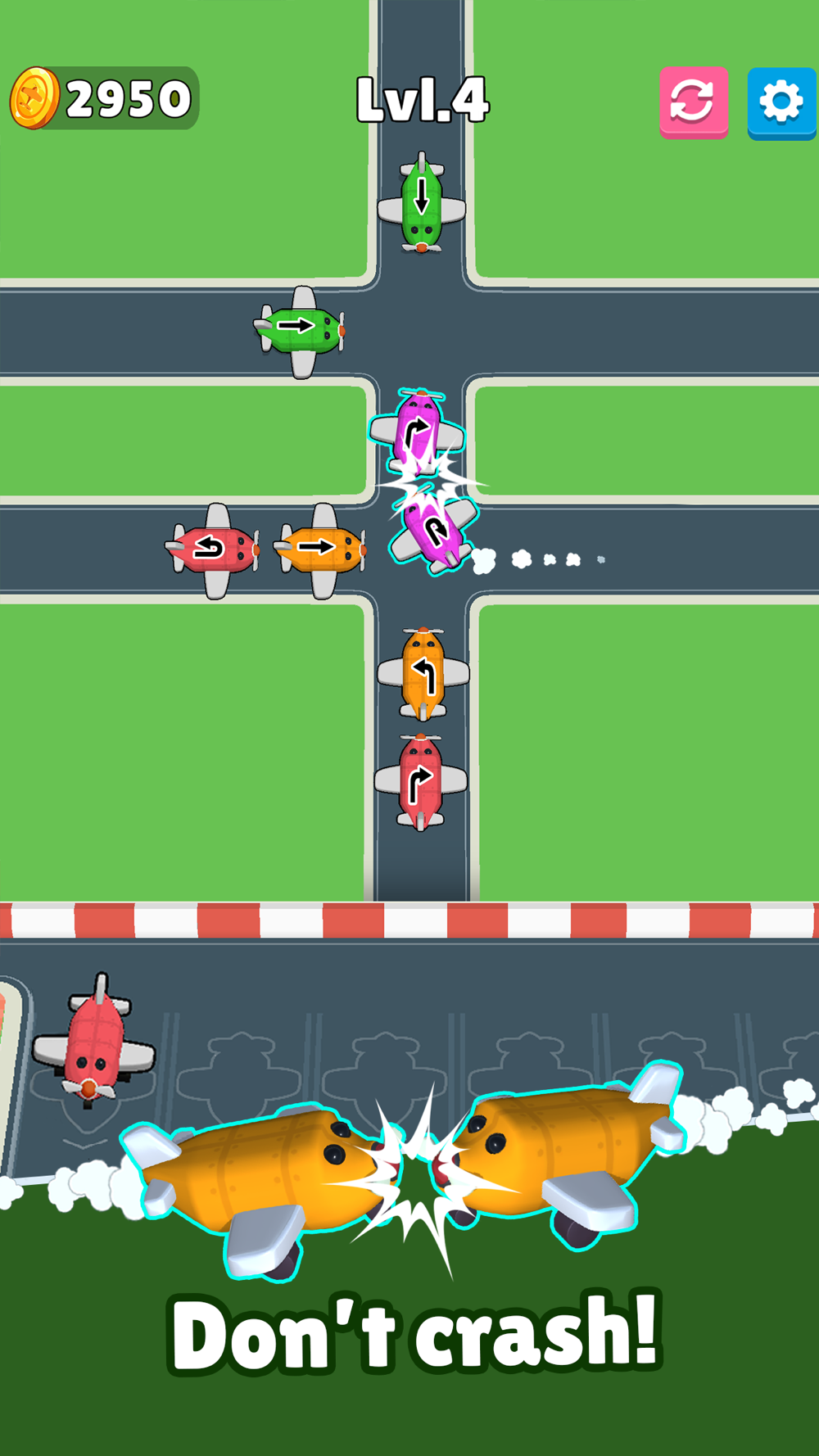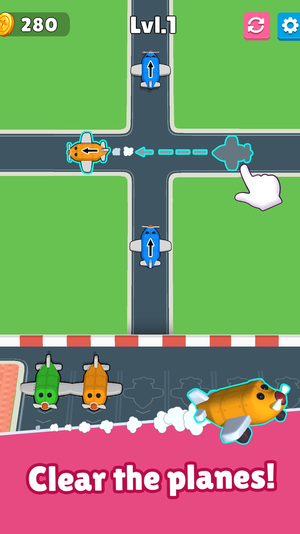 Match 2 Mechanics: Pair planes of the same color to clear the runway dock