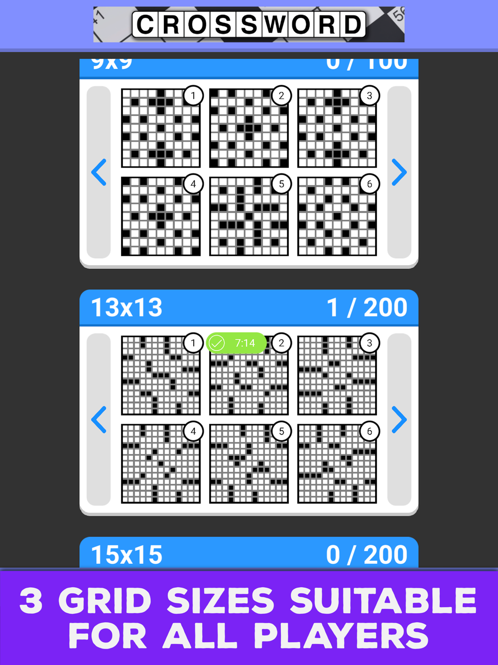 4 grid sizes of 9x9 (beginner), 11x11 (novice), 13x13 (novice) and 15x15 (expert) are available, so whether you've never played a crossword or you play them all the time - you can be sure that this is the crossword app for you!