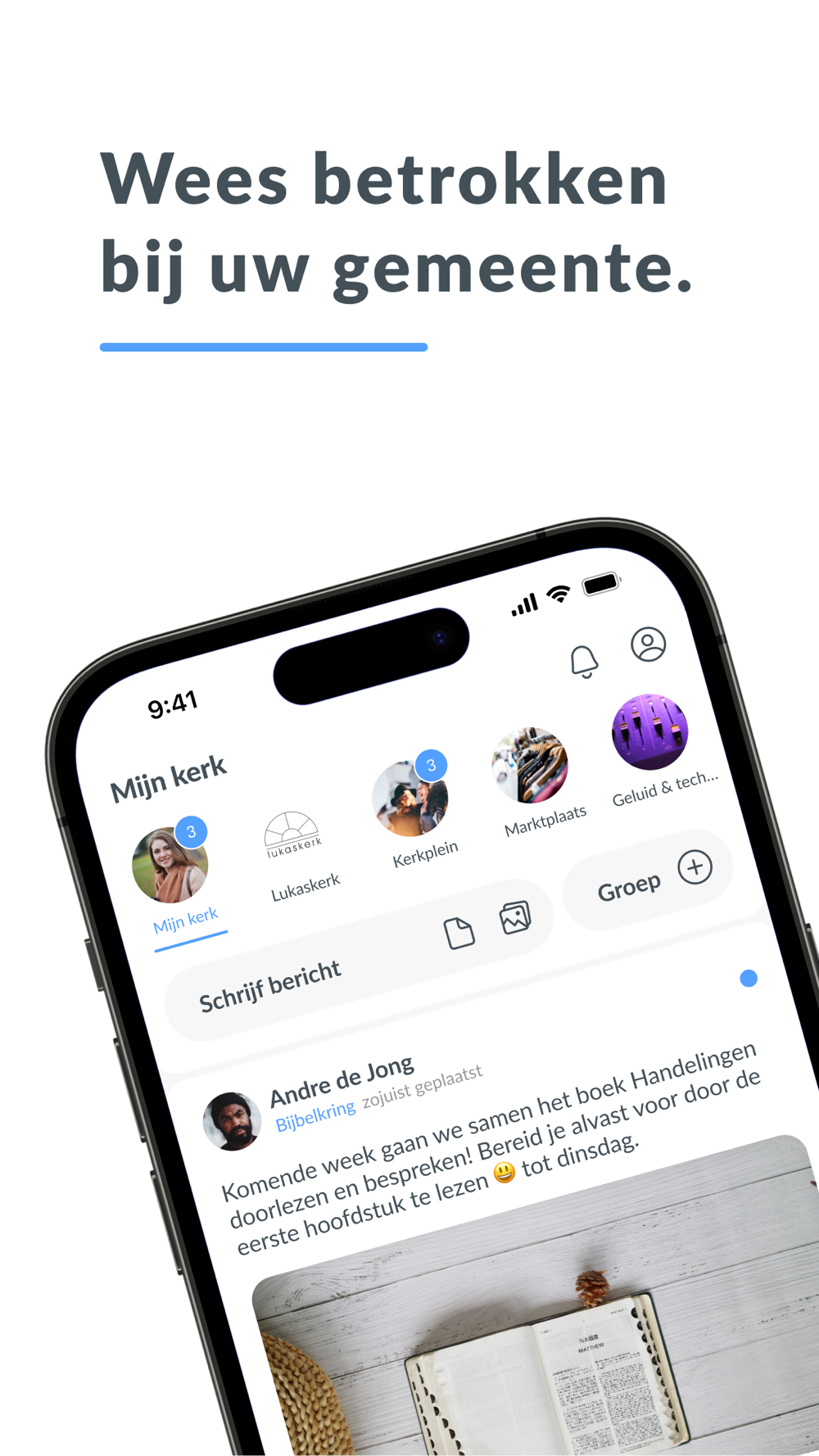 Dankzij onze unieke groepenstructuur helpen wij kerken beter te communiceren. Met de hele gemeenschap, maar ook onderling. U kunt zelf groepen toevoegen en mensen daarvoor uitnodigen. Een slimme timeline zorgt er voor dat iedere gebruiker persoonlijke en relevante informatie ziet.