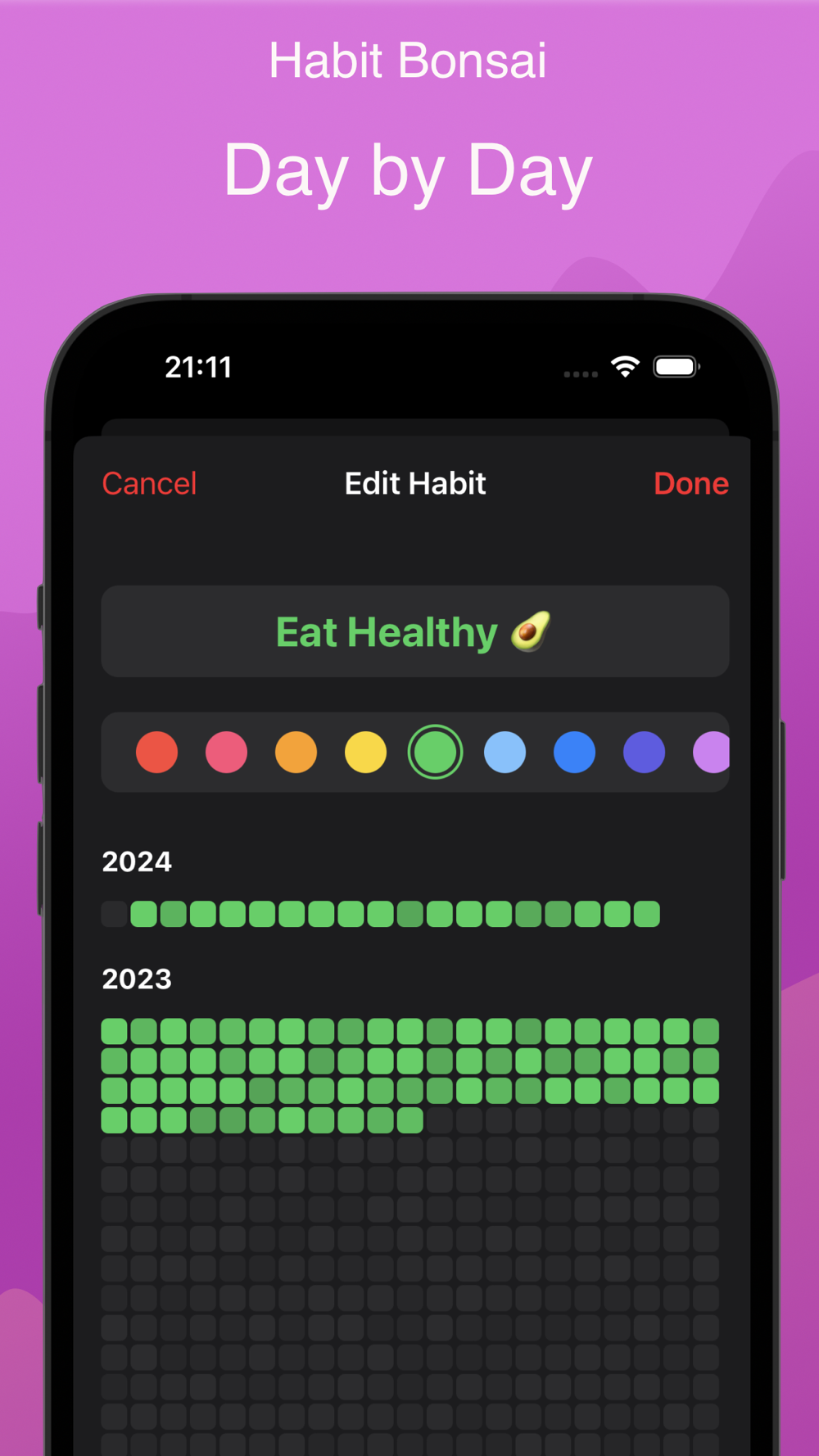 Picture this: a daily canvas of success, where each coloured tile represents your unwavering commitment. Marvel at the flourishing growth of your habits, providing the motivation you need to firmly adhere to each one habit, day by day. Habit Bonsai is more than an app; it's a fostering ground for positive change.