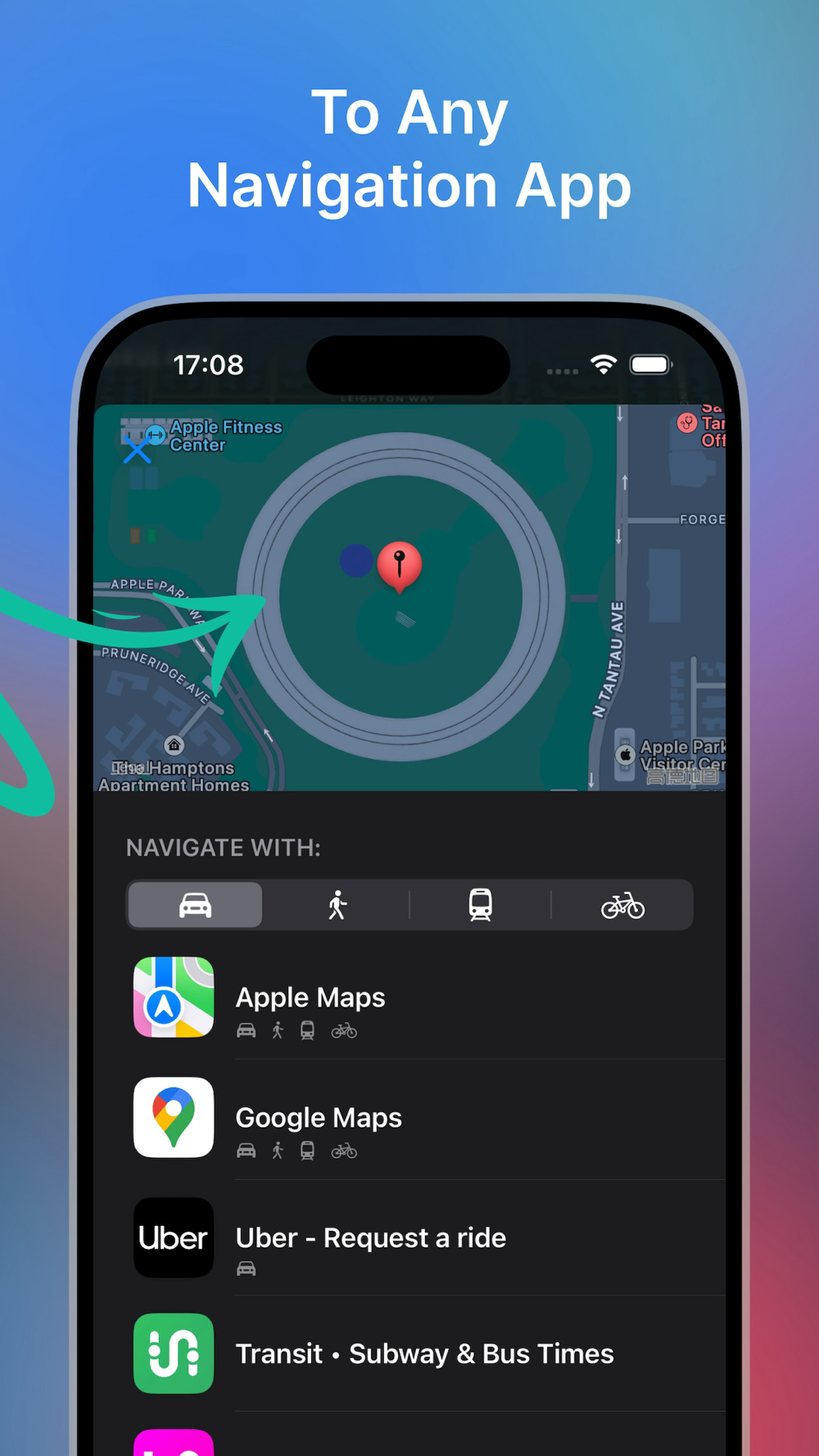 - Custom URL Scheme: Navify also supports a custom URL scheme (navify://) that allows you to specify latitude and longitude coordinates directly. By using the custom URL scheme, you can navigate to specific locations by simply entering the coordinates in the format navify://to?lat=latitude&lon=longitude. For example Apple Park navify://to?lat=37.334900&lon=-122.009020