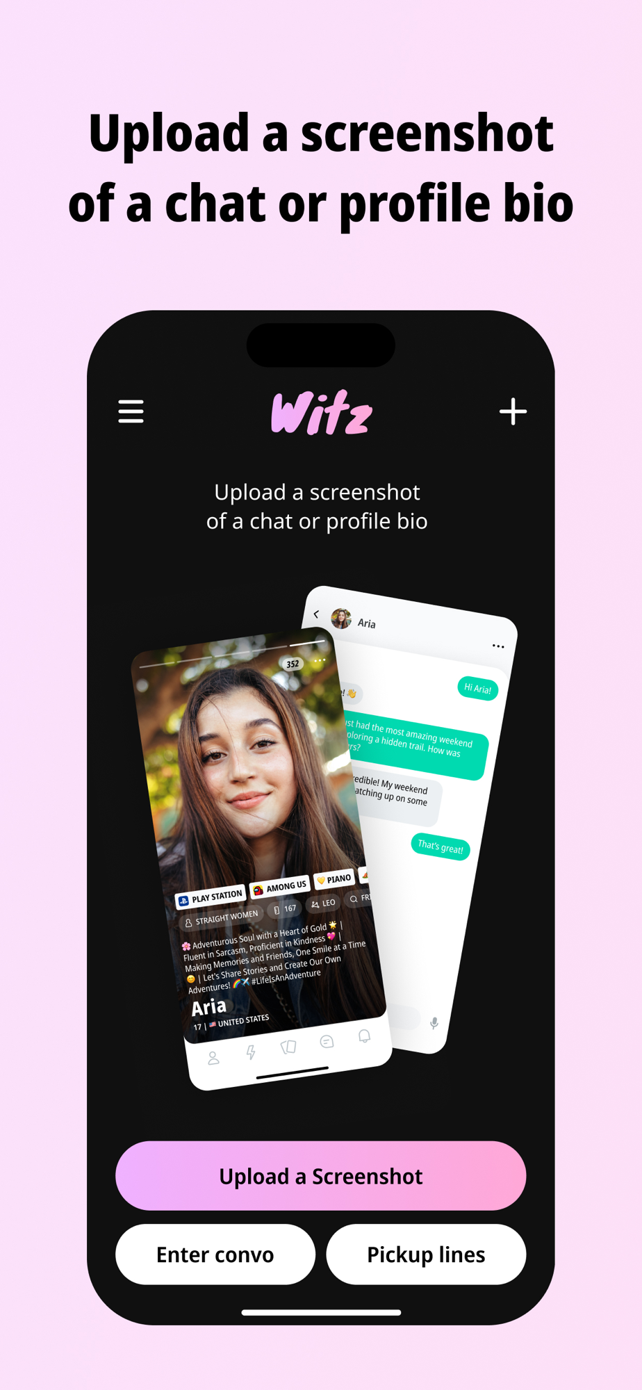Stuck in a chat? Simply upload a screenshot of your chats and bios, and Witz takes charge! Whether it's crafting PickUp Lines, sustaining a dating conversation, or winning over your crush, Witz has your back.