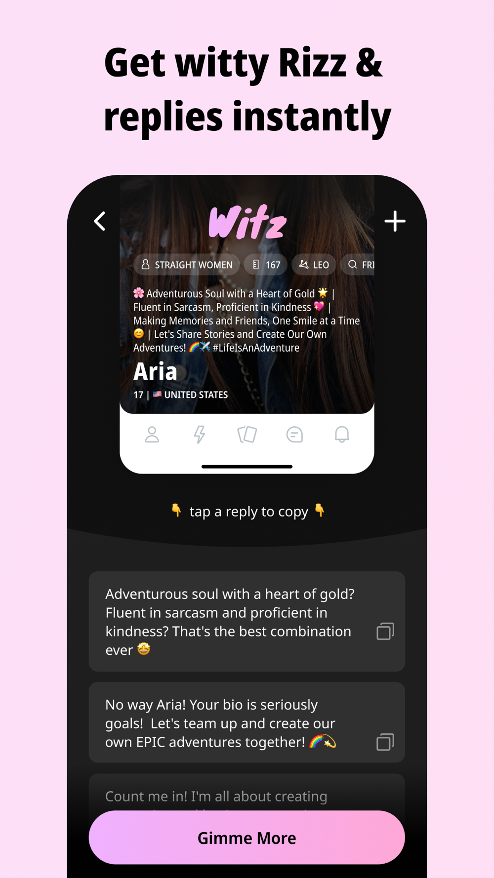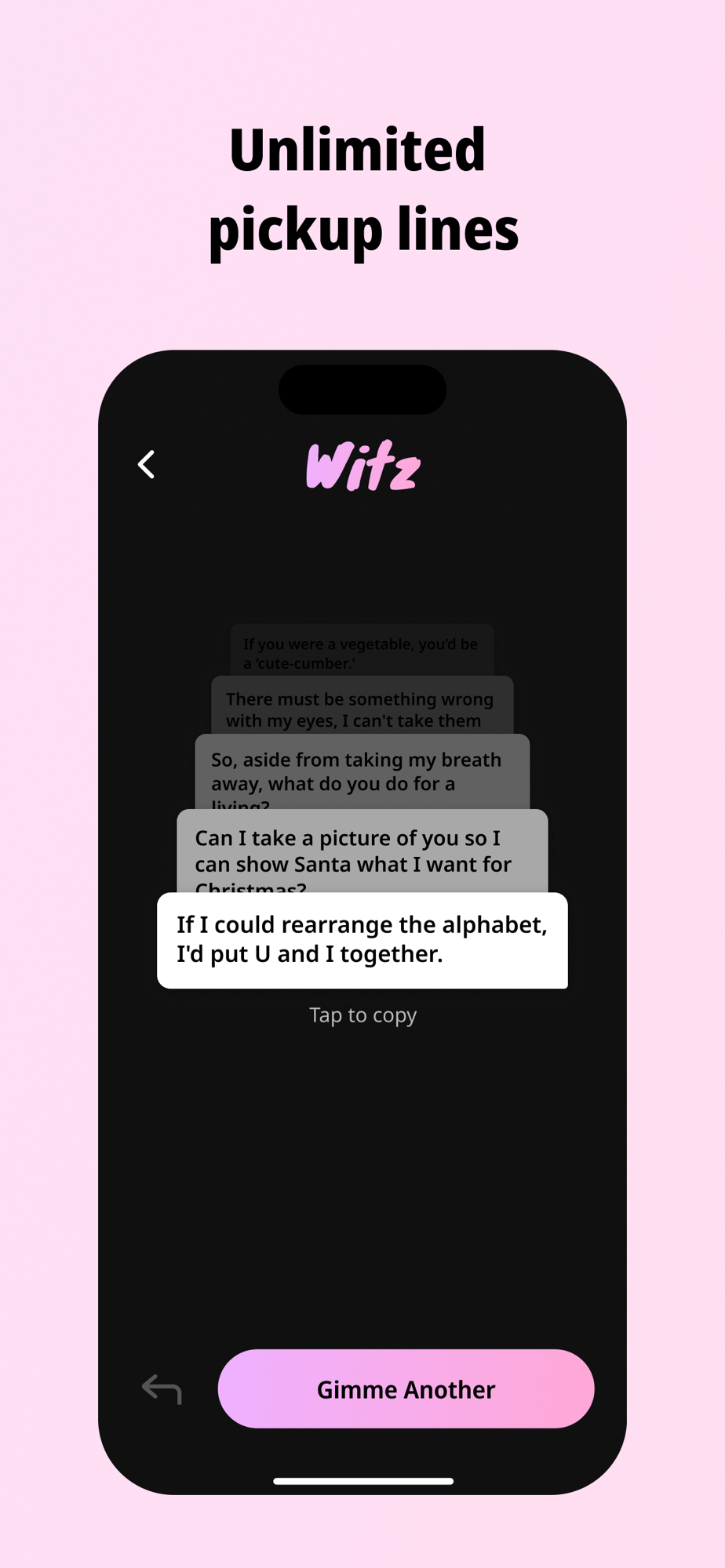 Revolutionize your dating experience with Witz! Our AI-driven app, powered by cutting-edge GPT technology, ensures you never run out of charming things to say to your crush.