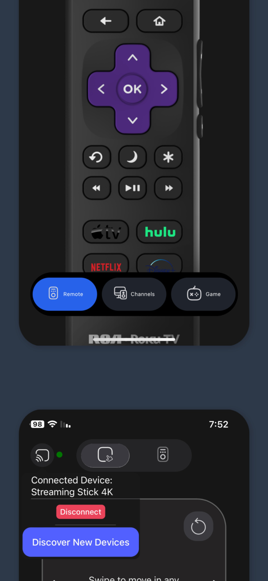 Universal Roku and Android TV Remote: Effortlessly control your Roku device from your smartphone. Play, pause, fast-forward, and more with intuitive touch controls.
