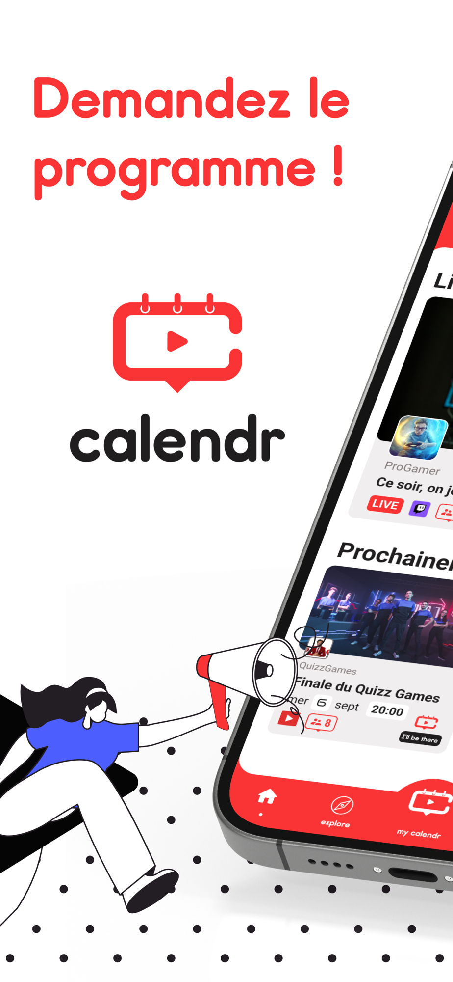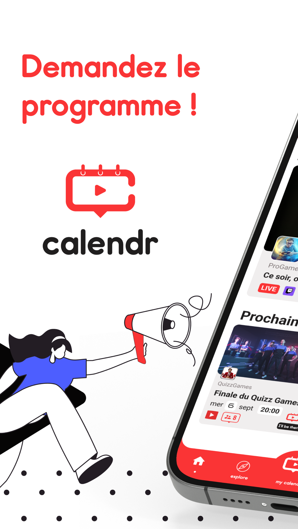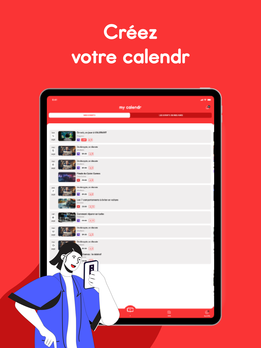 Date, heure, plateforme, talent… AVEC CALENDR, découvrez le programme à venir de vos streamers et créateurs de contenu favoris. Ne ratez plus leurs events !