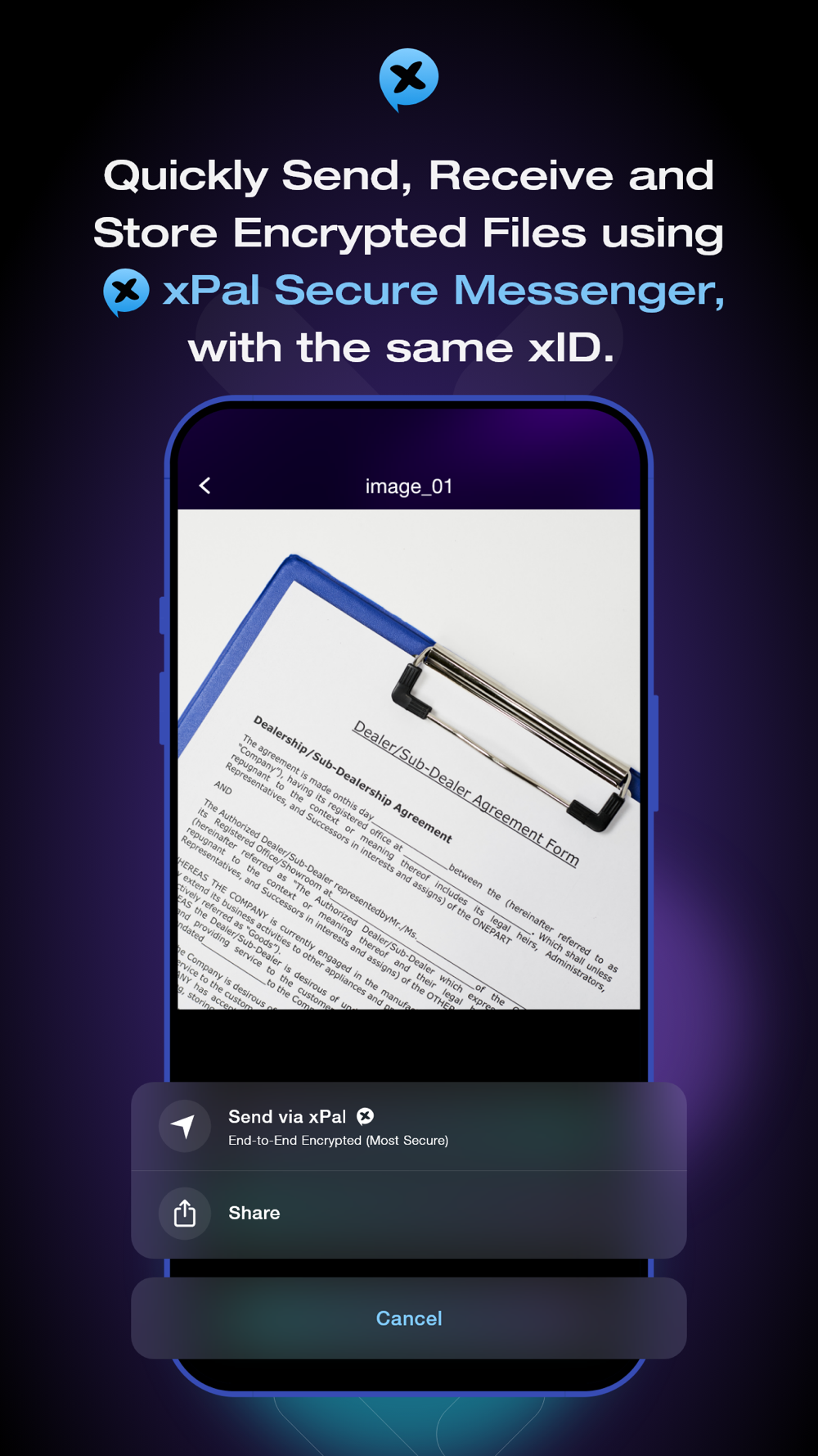Xave provides you with more than just a secured local encrypted space on your device. It also allows you to send and receive encrypted files through xPal Secure Messenger, without the need for any additional registration.