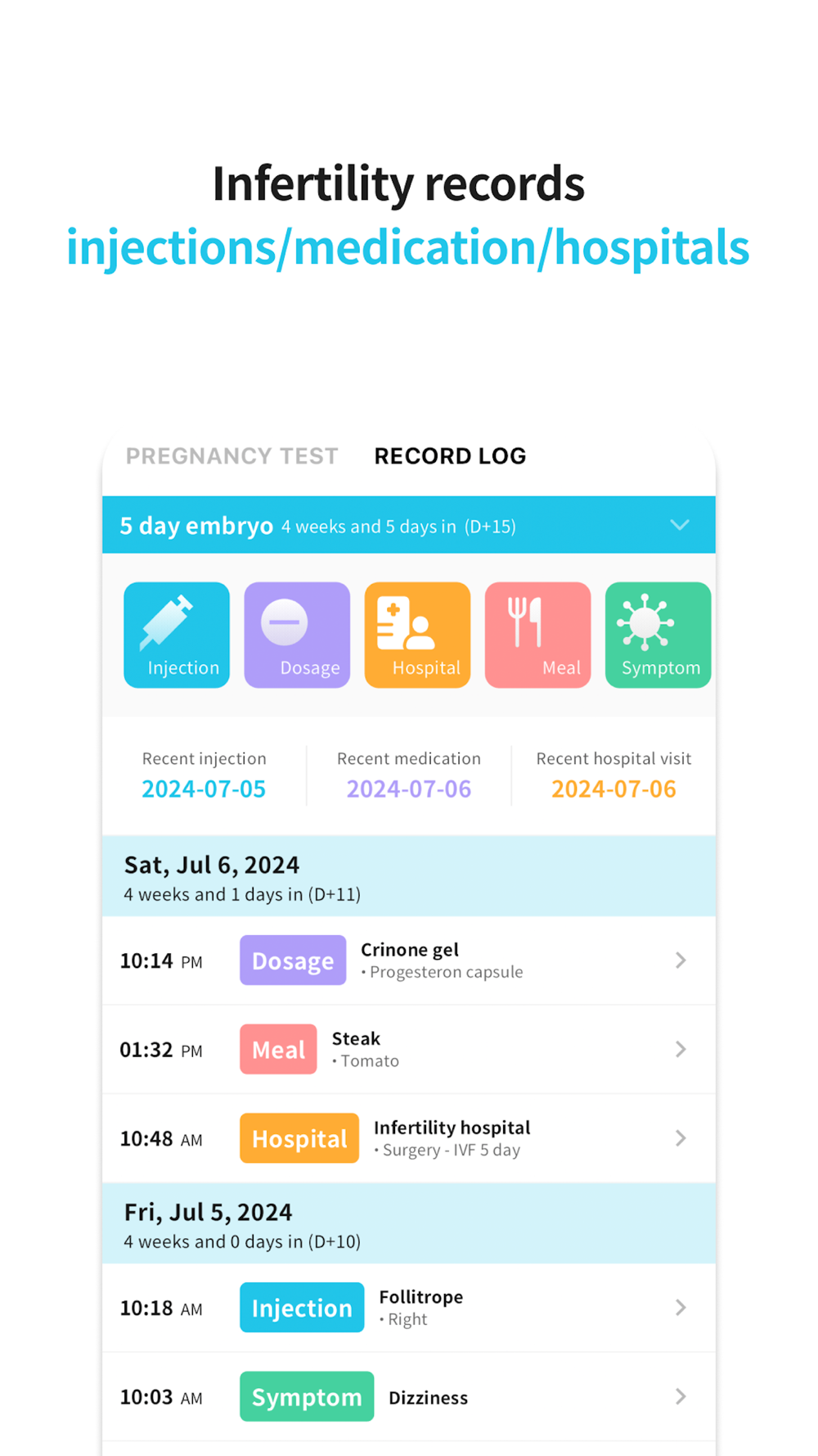 - Record log: You can create and manage various records before and after infertility treatment. Record injections, medications, hospitals, meals, and symptoms every day with simple actions.