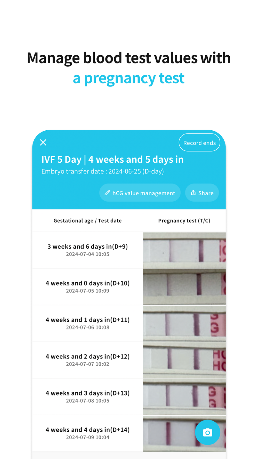 - Pregnancy tester: If you record the date of infertility treatment, the pregnancy week is automatically calculated. Take a pregnancy test and record the blood test records, if any. You can check the changes in your b-hCG hormone levels each week of pregnancy.