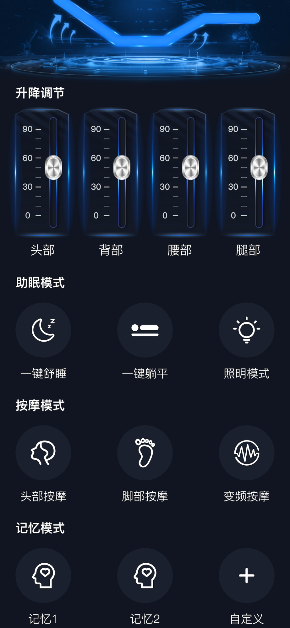 APP界面与遥控器基本相同,便于客户认知及直接使用。不同的按键对应不同操作方式,使用简单,轻松控制电动床的头部或腿部抬升或下降,即可单独控制不同部位升降,也可以实现联动操作。具备不同模式的附加功能,如照明开启关闭、按摩模式、阅读模式、观影模式等,均可在app上进行操作。可以帮助用户便捷的进行智能化操作,附带睡眠健康数据的监测、分析及展示等功能特点,可以查询数据信息。
