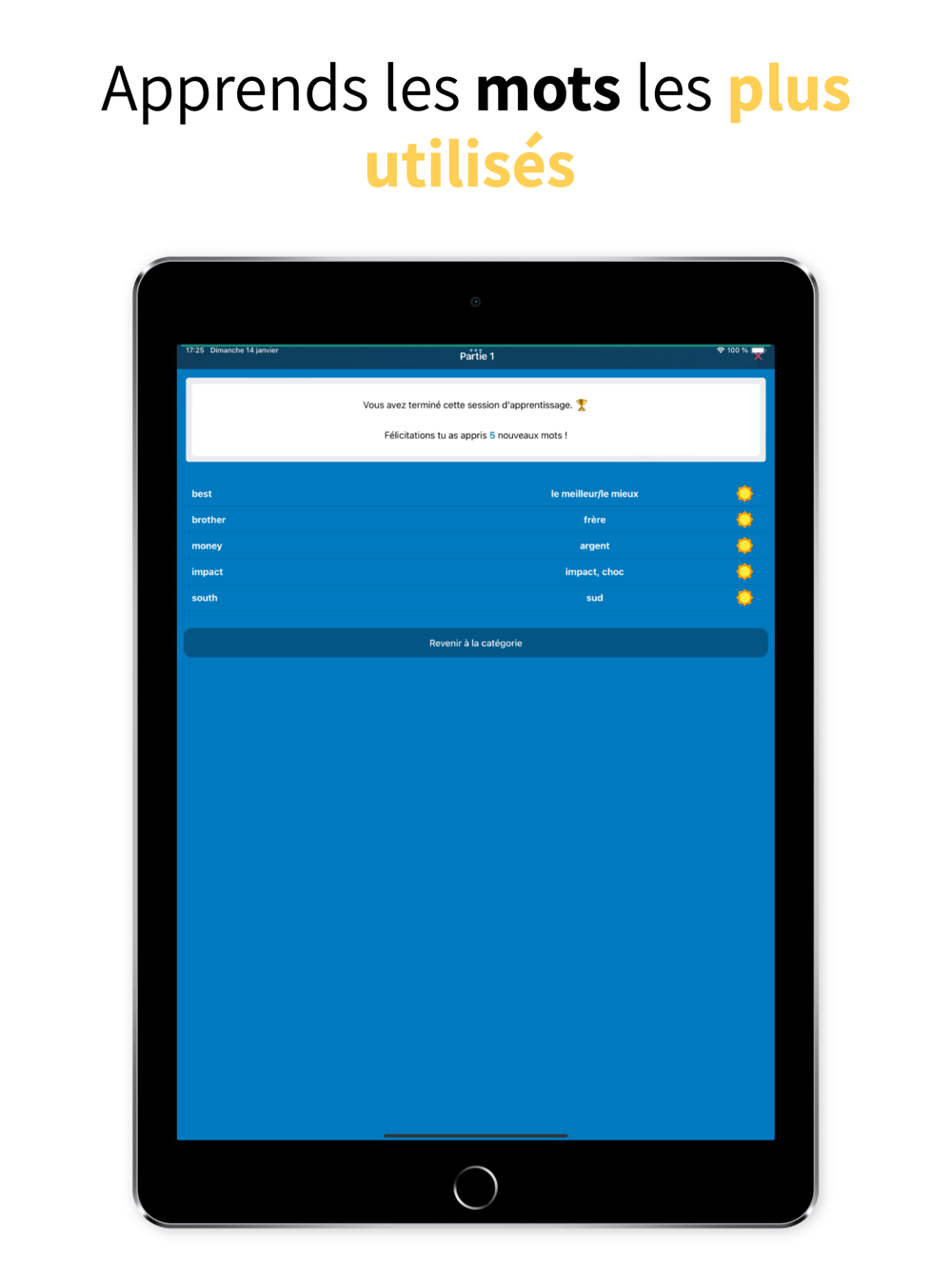 Mémorise un maximum de vocabulaire anglais tout en t’amusant. En utilisant cette application 5 minutes par jour, tu pourras enfin :