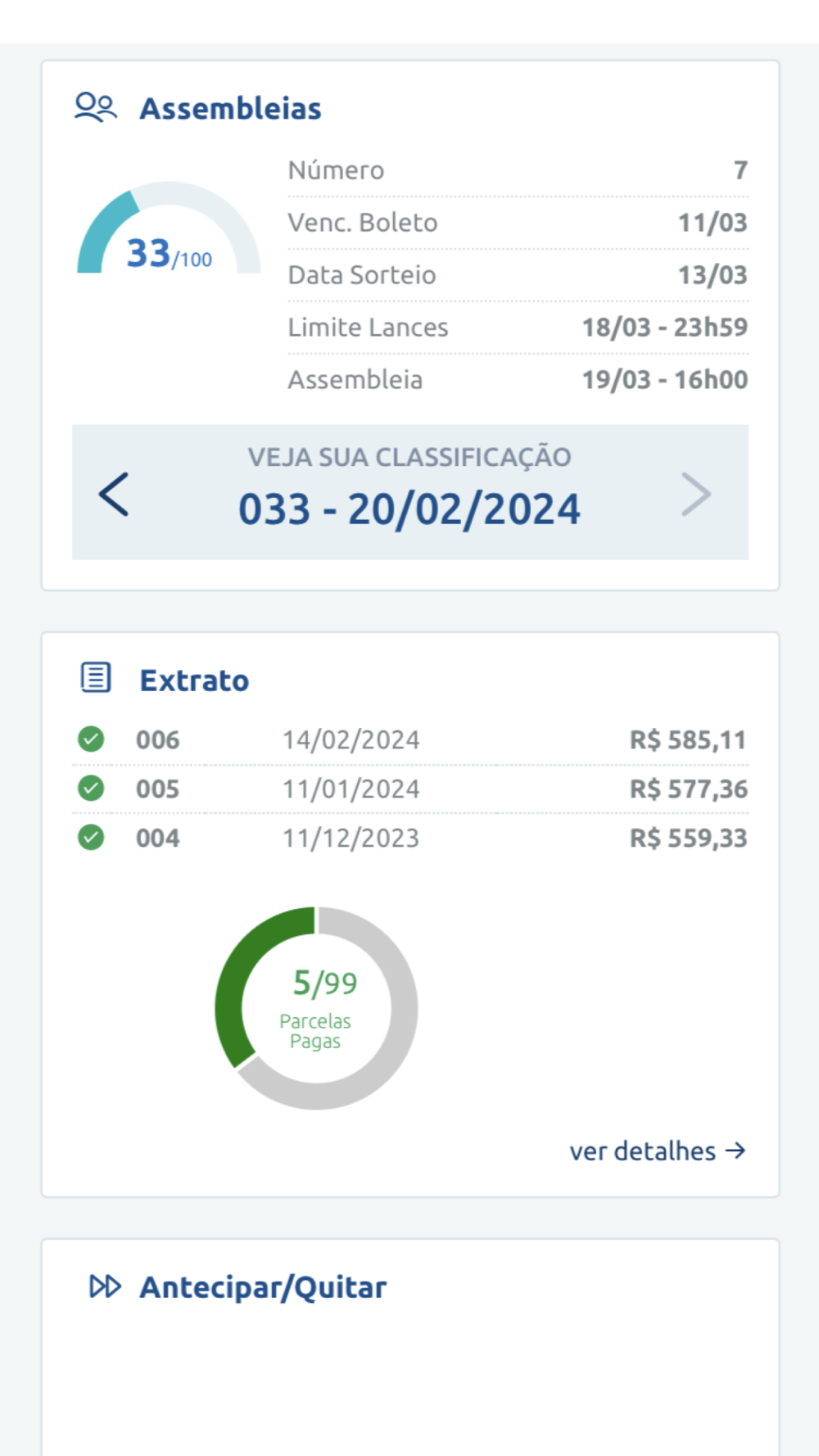 No Menu Serviços, você acessa as informações mais importantes do seu consórcio.
