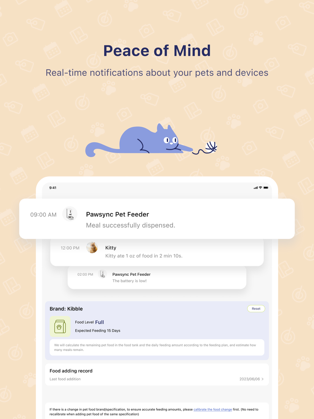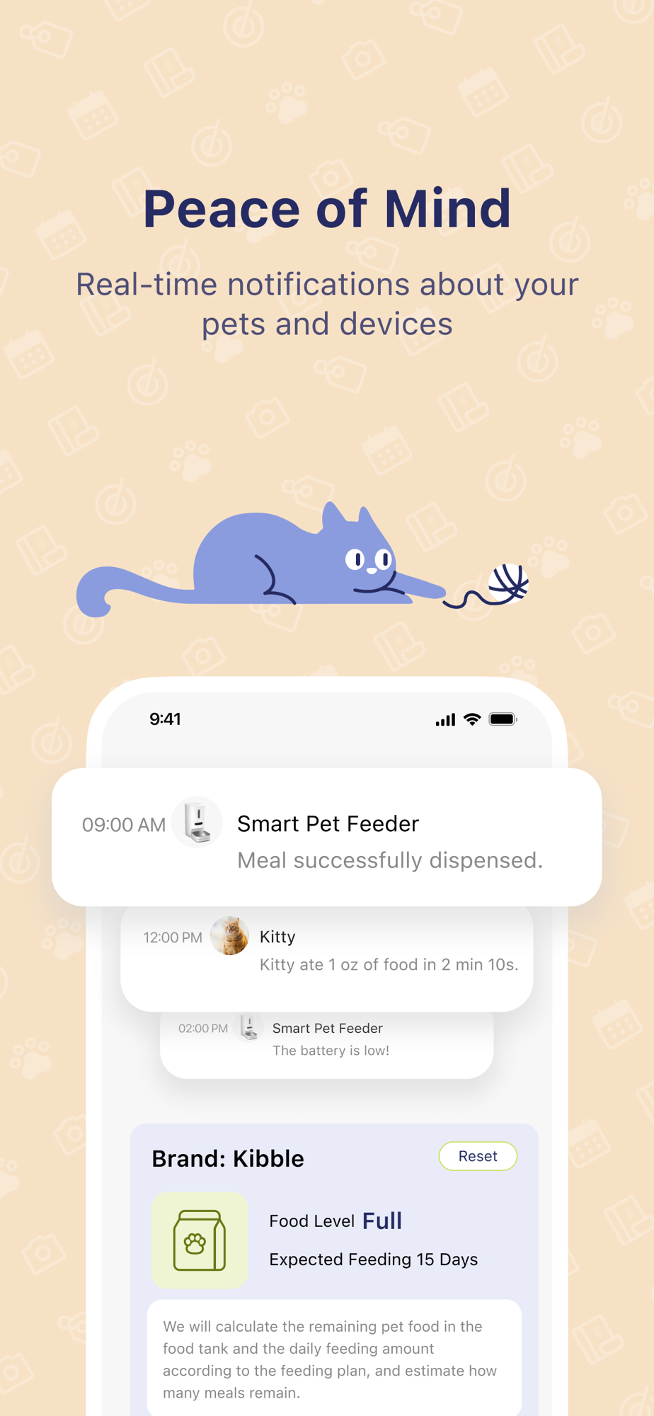 Receive alerts when it runs out of food, if there's a blockage, and more. These notifications help prevent any problems by keeping you up to date on your pet feeder.
