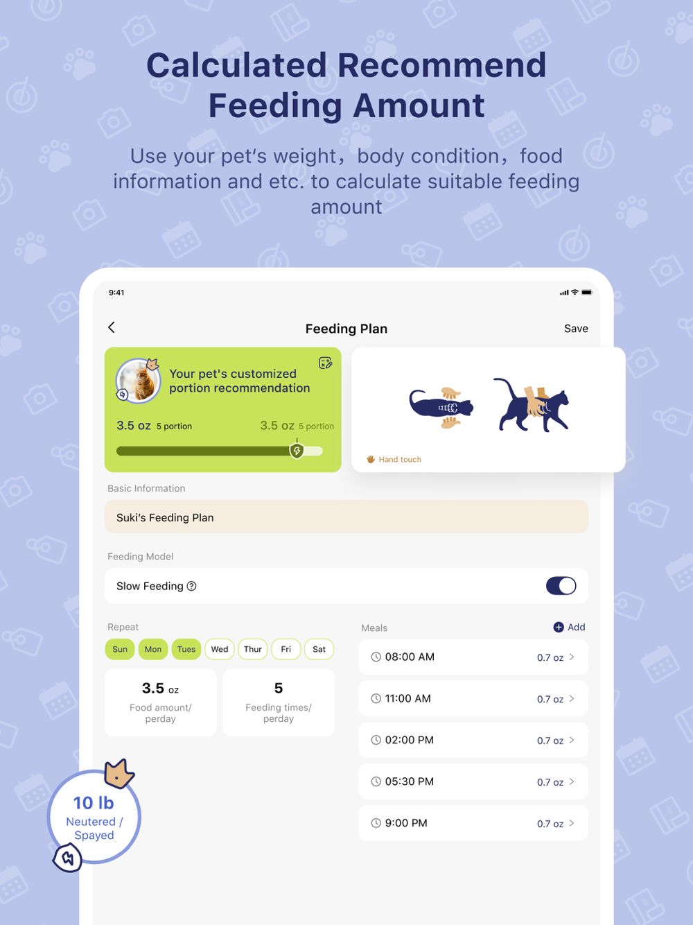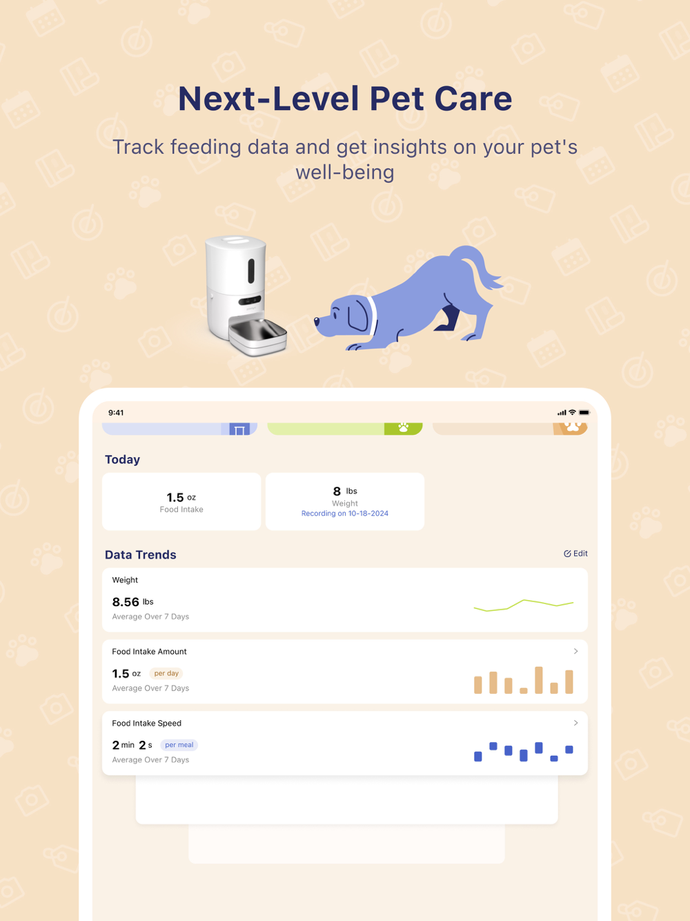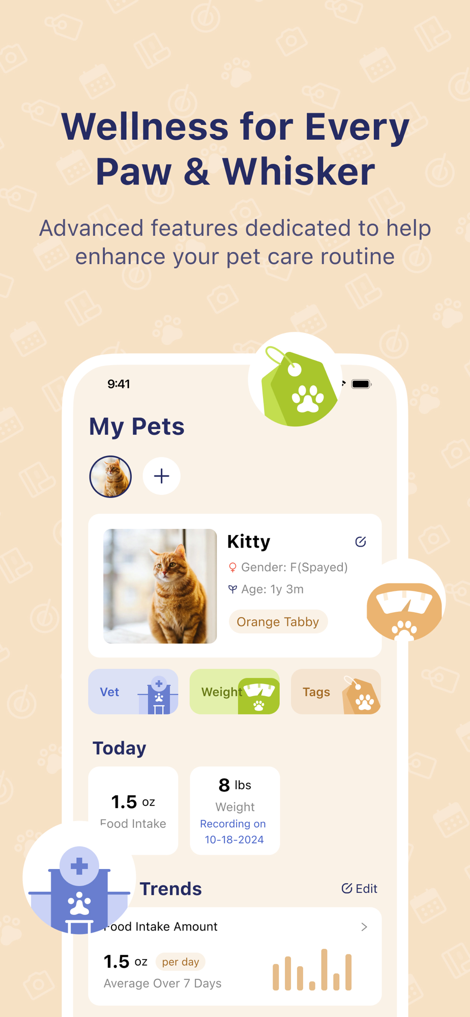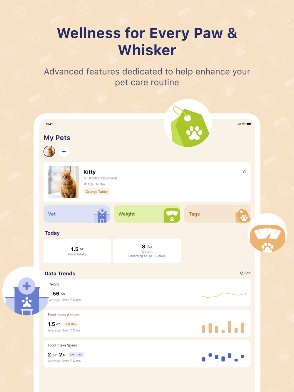 Our app tracks your pet's feeding data, provides pet behavior tags, and many other tools to help you discover changes in their consumption trends. You can also track your pet's visits to the vet, so you know when their next appointment is.
