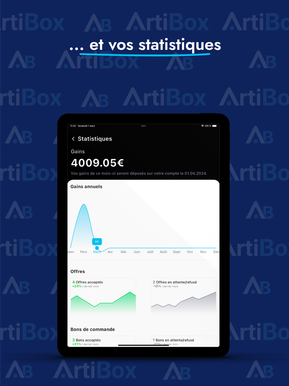 Elle offre une interface utilisateur intuitive, permettant une gestion fluide de vos chantiers, de vos devis, de vos factures, et plus encore. Avec ArtiBox, vous avez le contrôle total de votre activité professionnelle au bout des doigts.