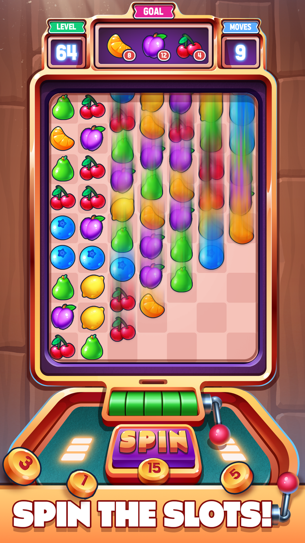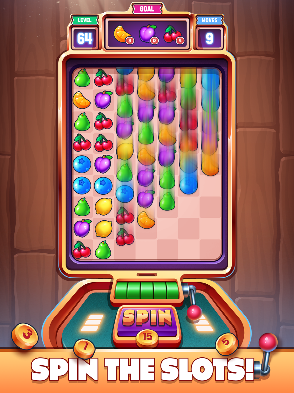 Are you ready to enter the crazy fun world of Match & Spin in this fresh and unique take on the Match 3 genre? This is not your ordinary Match game! Here the Slot Machine will spin the whole board every few turns and change your odds of winning! Or you can do it yourself. Ever find yourself stuck? No worries! Use your bonus spins and push your luck through the Slot Machine! Get powerful Power-Ups and blast the board! Let the fun begin!