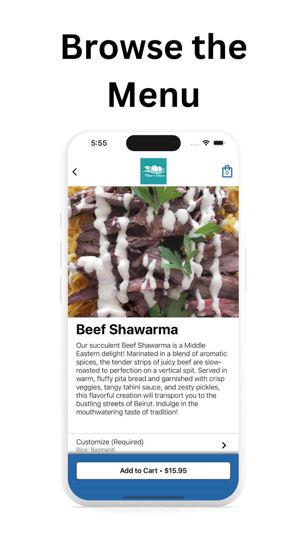 The Mint and Olives mobile app is finally here! Order from your favorite delicious local restaurant and get access to exclusive deals and menu items. After creating an account, you'll also earn points and rewards to use the next time you order! From our shawarmas to our wraps, there's something for everybody. We can't wait to see you!