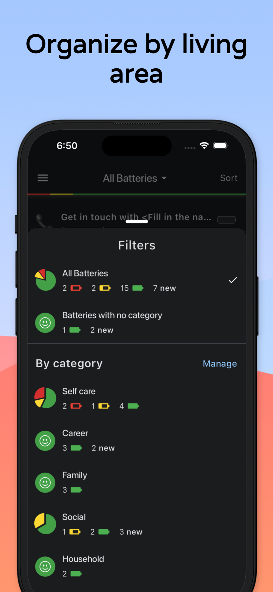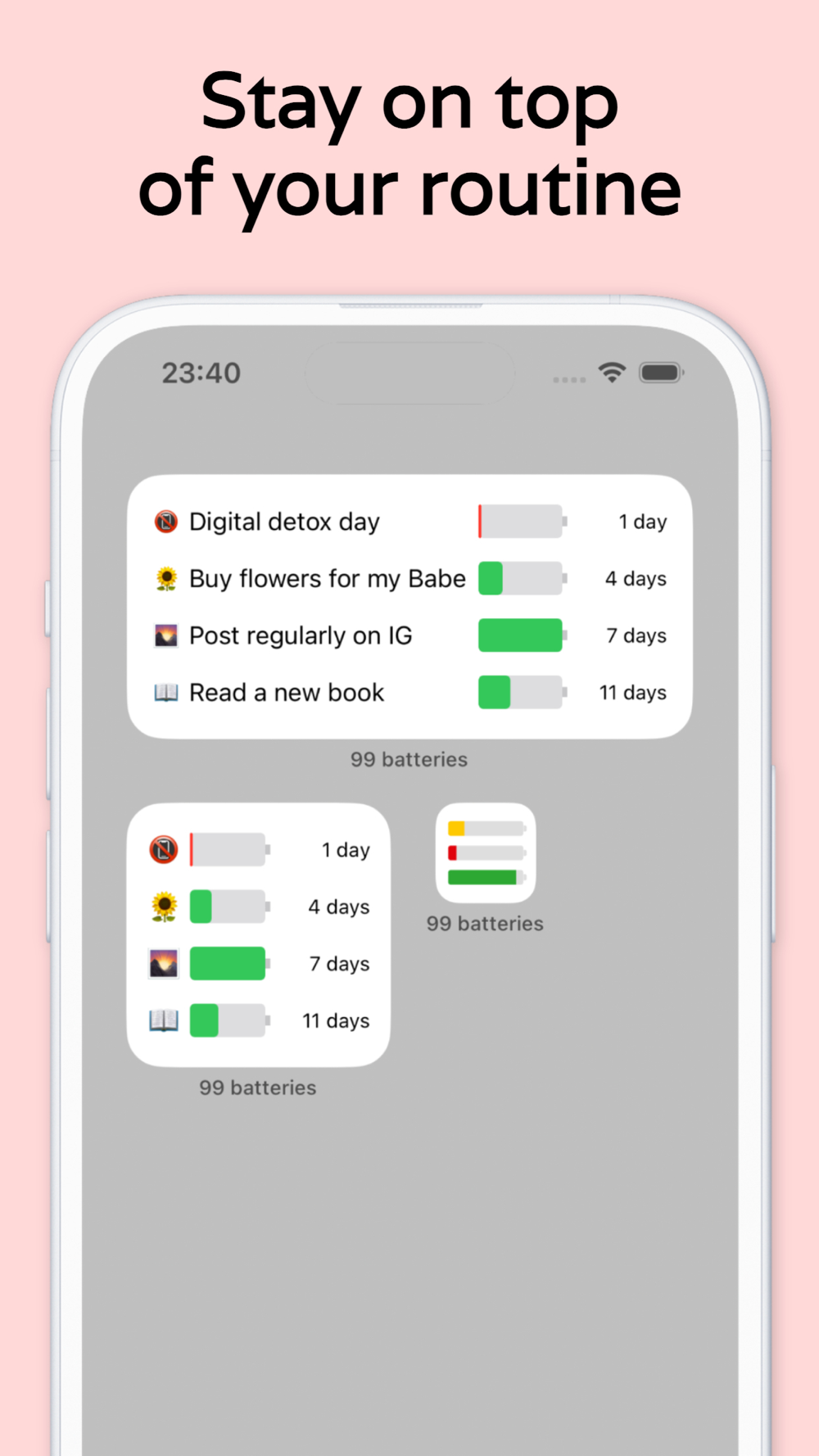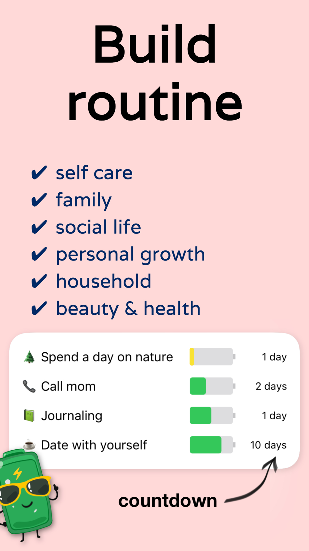 • Innovative Battery System – manage your tasks as individual batteries, each representing a different aspect of your life – from self-care to weekly chores. Set deadlines and watch as each battery depletes over time, offering a clear, visual countdown until the due date;