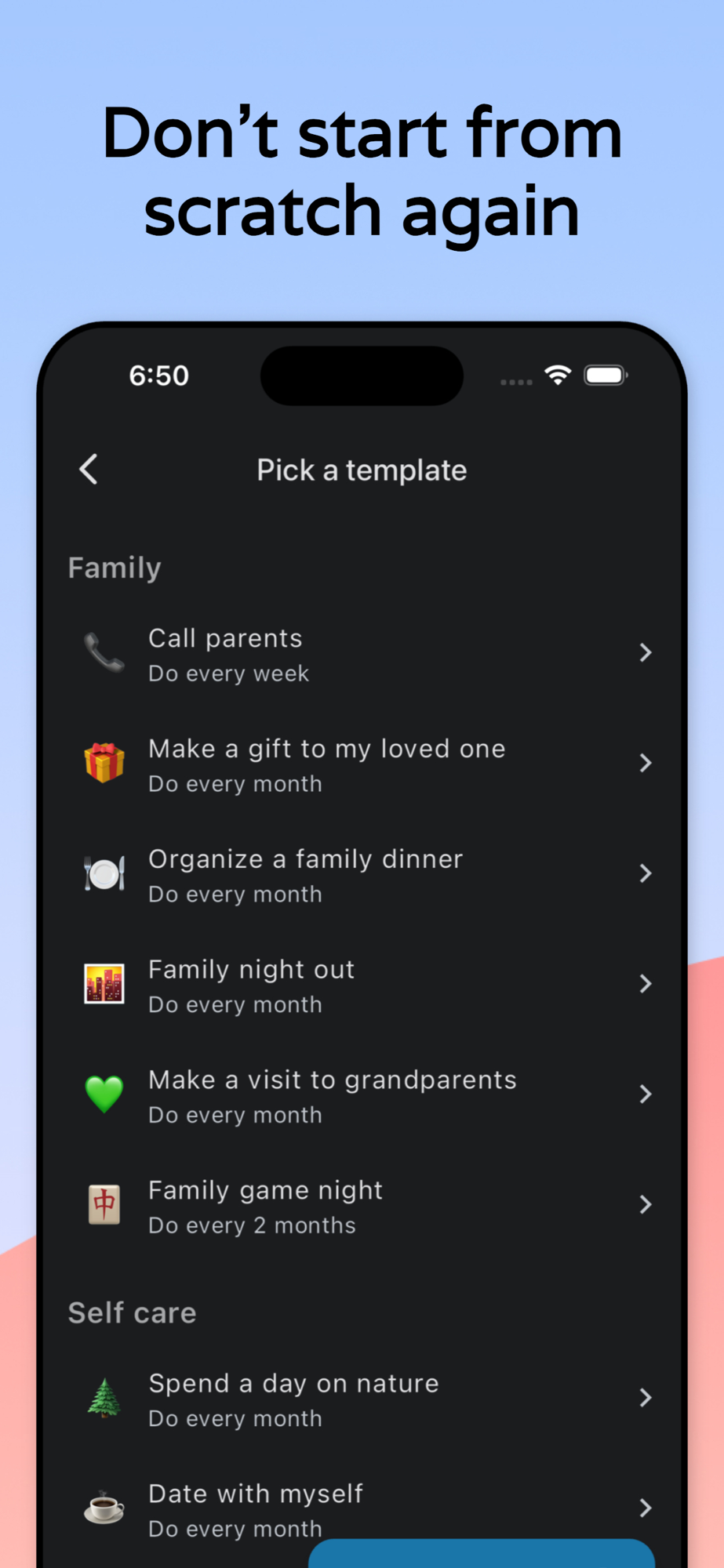 • Customizable Categories: Organize your tasks into life areas such as Personal Growth, Household, Career, Beauty and Health, Social Relations, Family or any category that fits your lifestyle. Keep your routines sorted and your mind uncluttered;