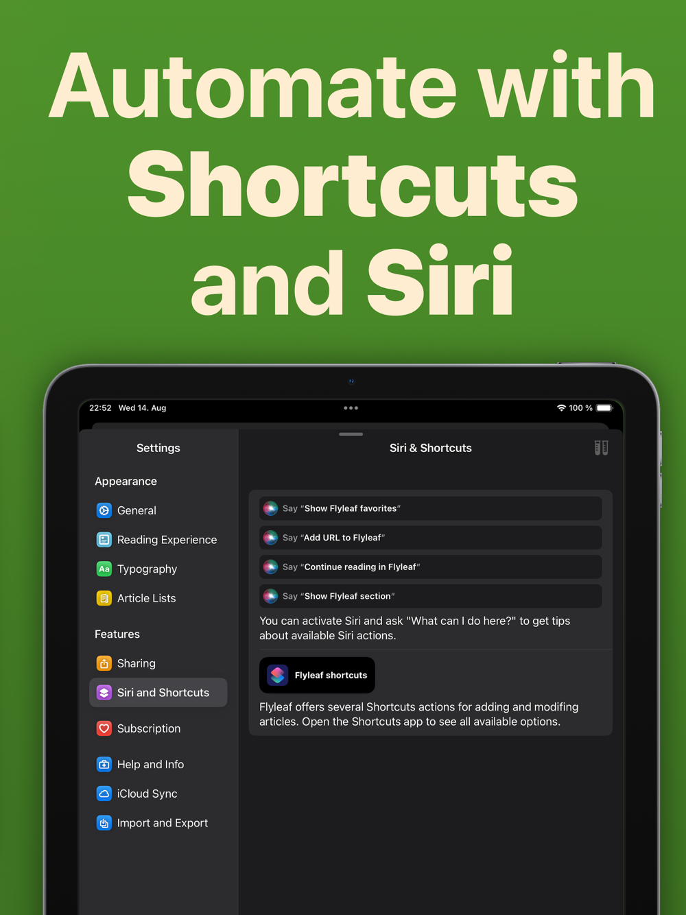 Flyleaf offers a comprehensive list of Shortcuts actions, so you can add URLs via Siri or build Shortcuts to automatically tag articles.