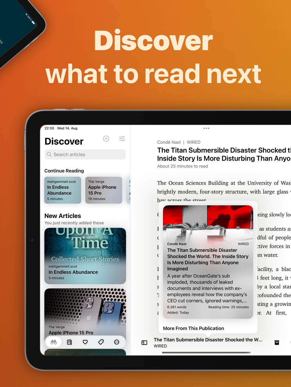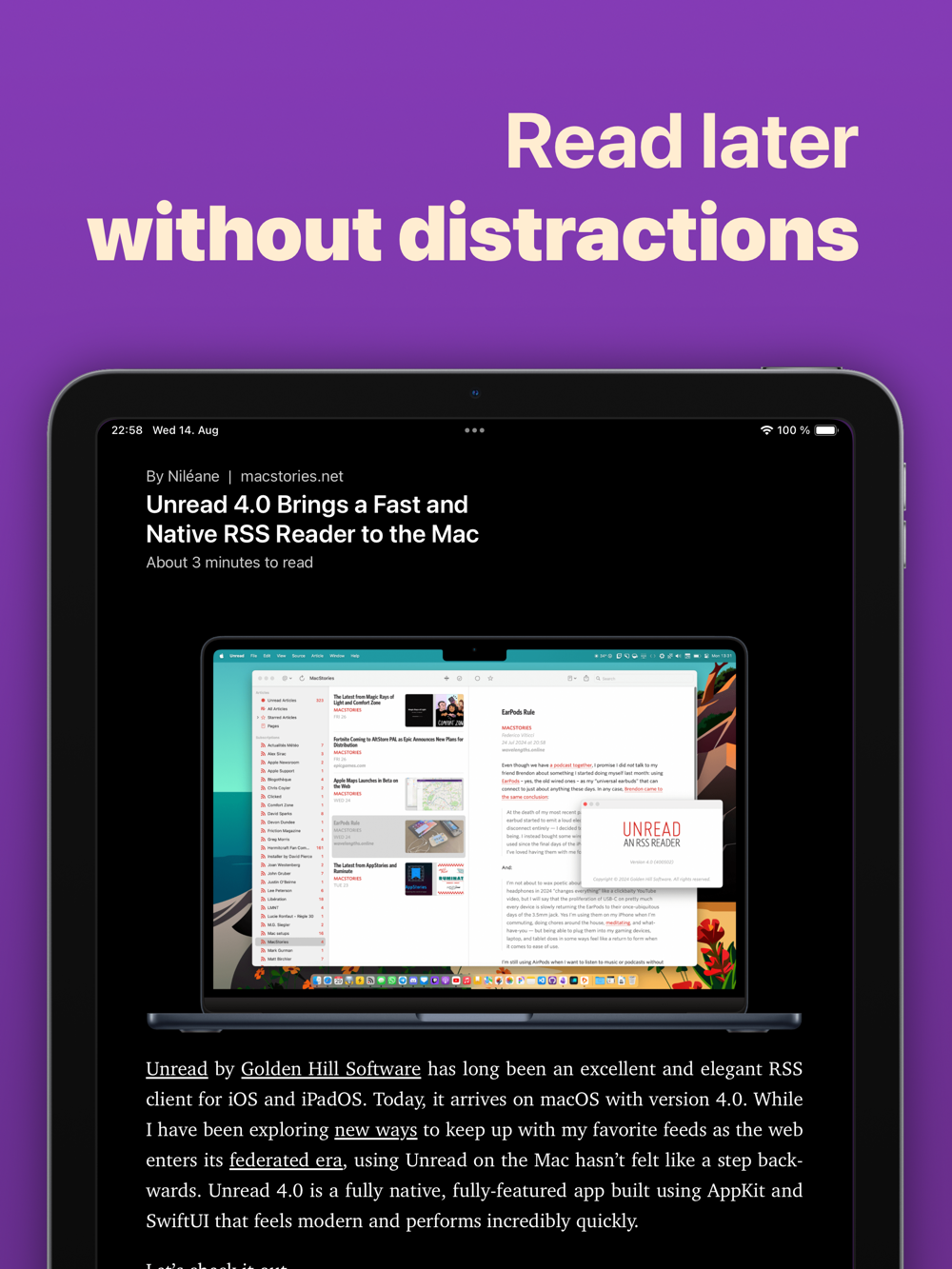 Flyleaf uses iCloud to securely sync articles and reading progress between your devices – no additional signups needed.