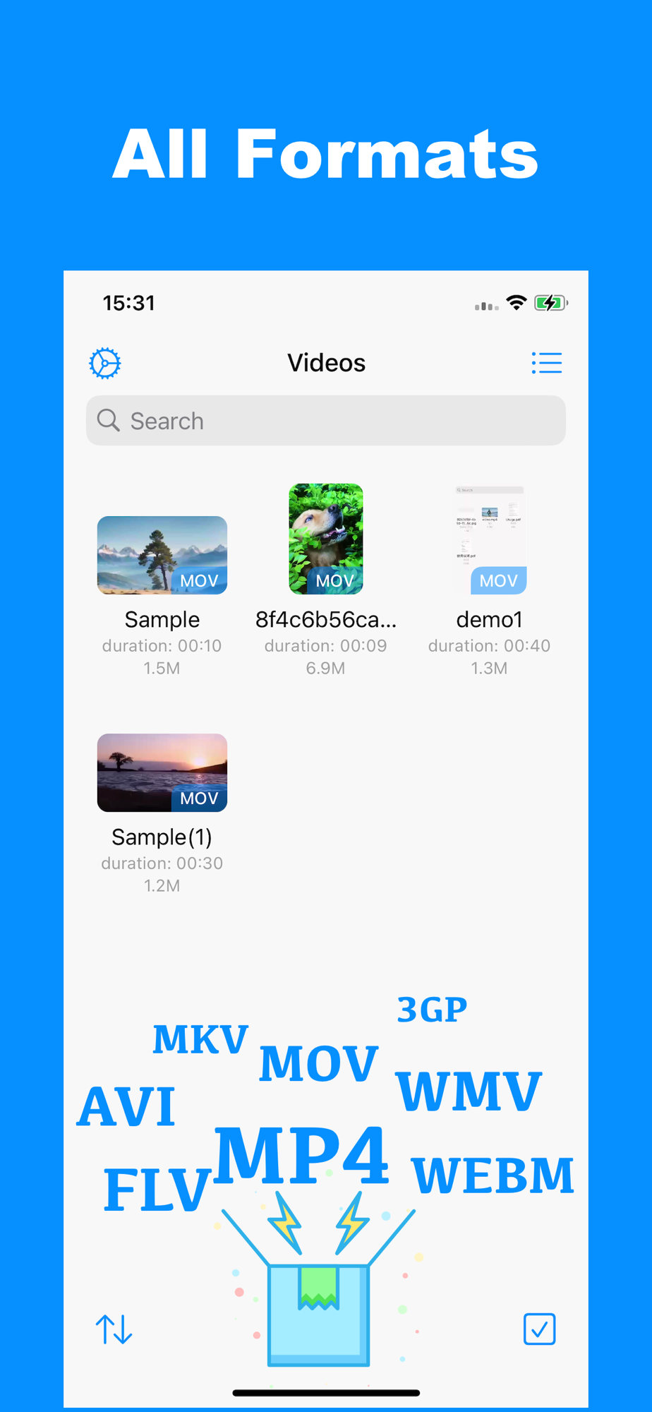 Our app supports a wide range of video formats including MP4, MKV, AVI, MOV, FLV, WMV, MPEG, WebM, 3GP, ASF, VOB, M4V, TS, H.264, and even GIF.