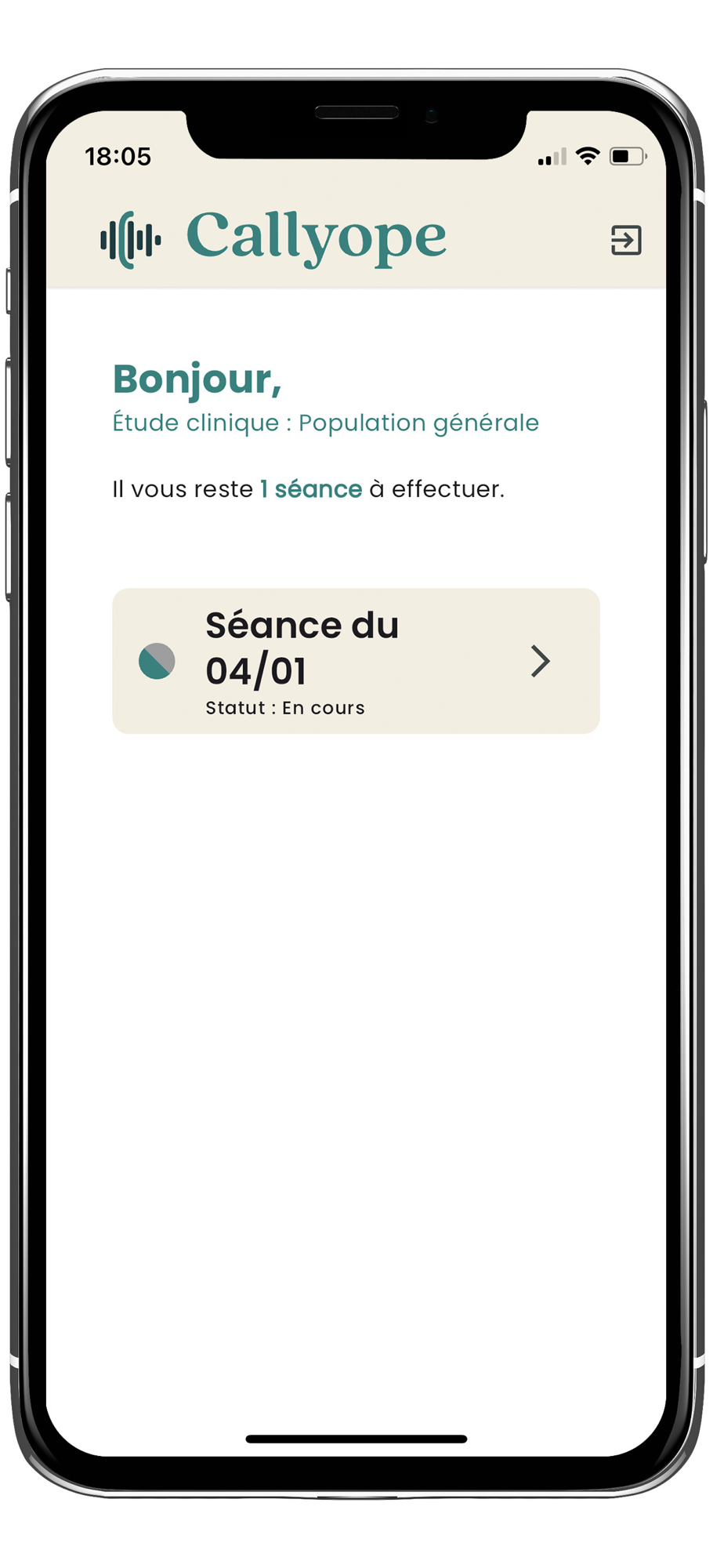Callyope est une application mobile conçue en collaboration avec des psychiatres et des patients pour améliorer la prise en charge des troubles psychiatriques tels que la schizophrénie et la bipolarité. Notre application de recherche utilise des techniques d’analyse de la voix et du langage pour permettre l’élaboration d’essais facilement autour de la parole ainsi que des informations cliniques