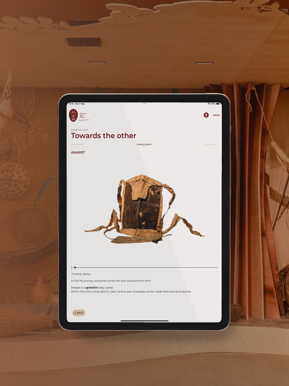 The app offers you three visit itineraries: a guide to the exhibition spaces (EXHIBITION ITINERARIES), which allows you to explore an interactive audio guide (STORY EXPERIENCE) and two itineraries designed for people with sensory disabilities: TOUCH EXPERIENCE, with audio-video descriptions integrated with tactile panels located along the itinerary, and LIS EXPERIENCE, with translation of the videos in the exhibition space into Italian Sign Language (LIS)