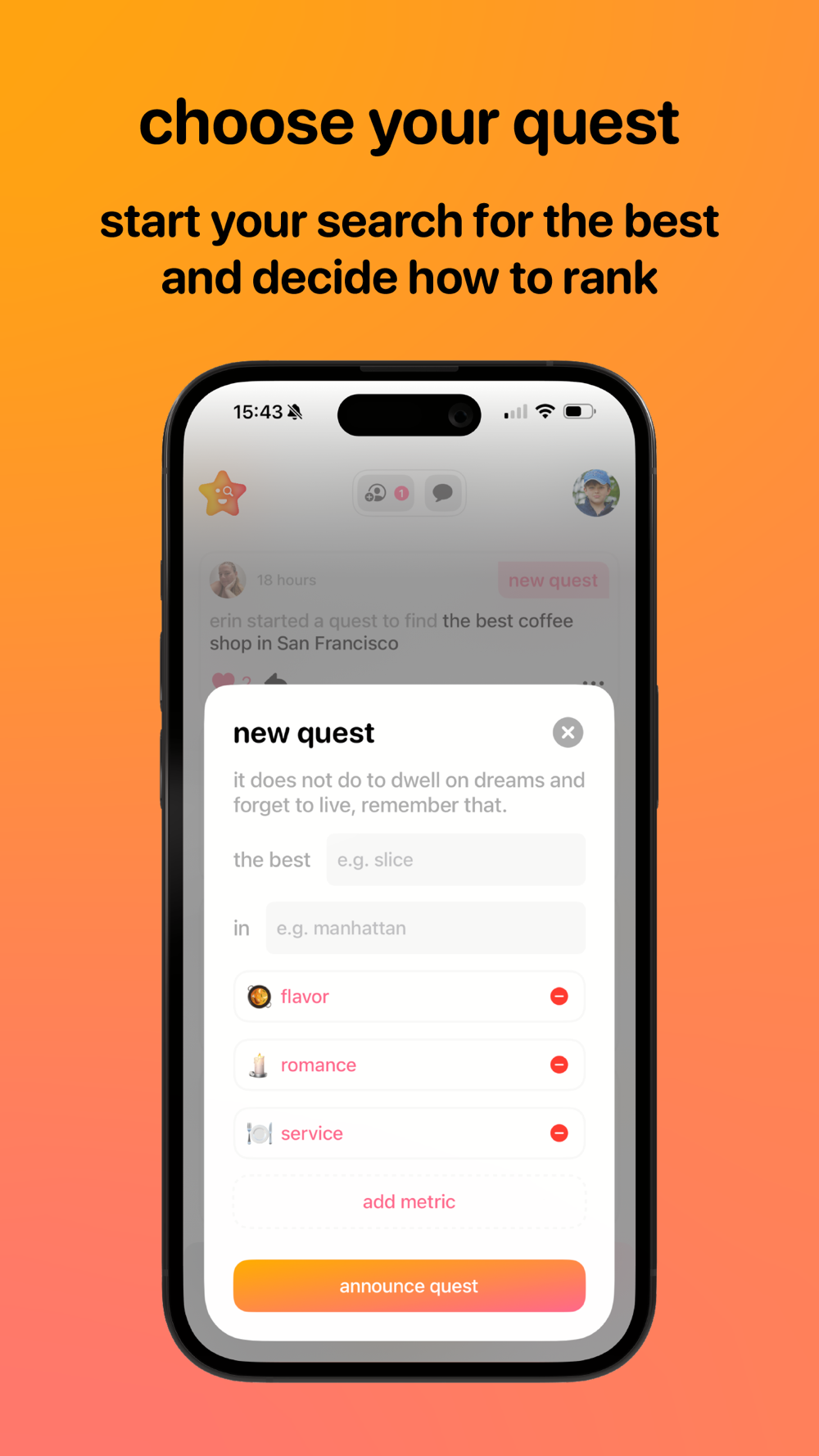 With Quest, you're not just finding places; you're creating a journey that's uniquely yours. Choose your quest and set your own criteria. Is it about flavor, ambiance, or maybe the perfect photo op? You decide what tops your list.