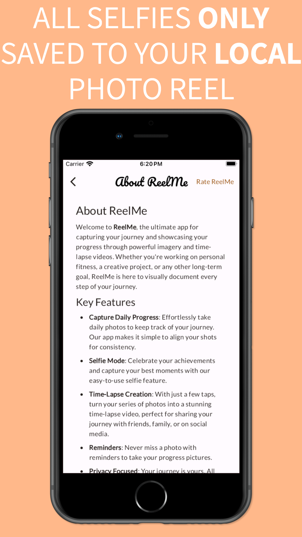 Capture the Moment: Effortlessly take daily selfies with our user-friendly interface. Whether it's your fitness journey, pregnancy, or just everyday life, ReelMe is your perfect companion.