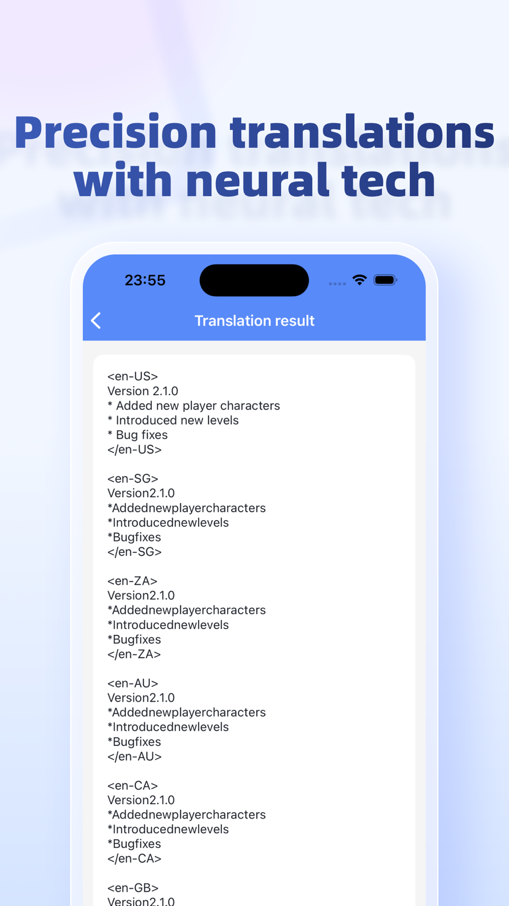 Automatic XML Formatting: Say goodbye to manual formatting. Our app automatically converts your translated text into XML format, adhering to Play's specifications, saving you time and reducing the potential for errors.